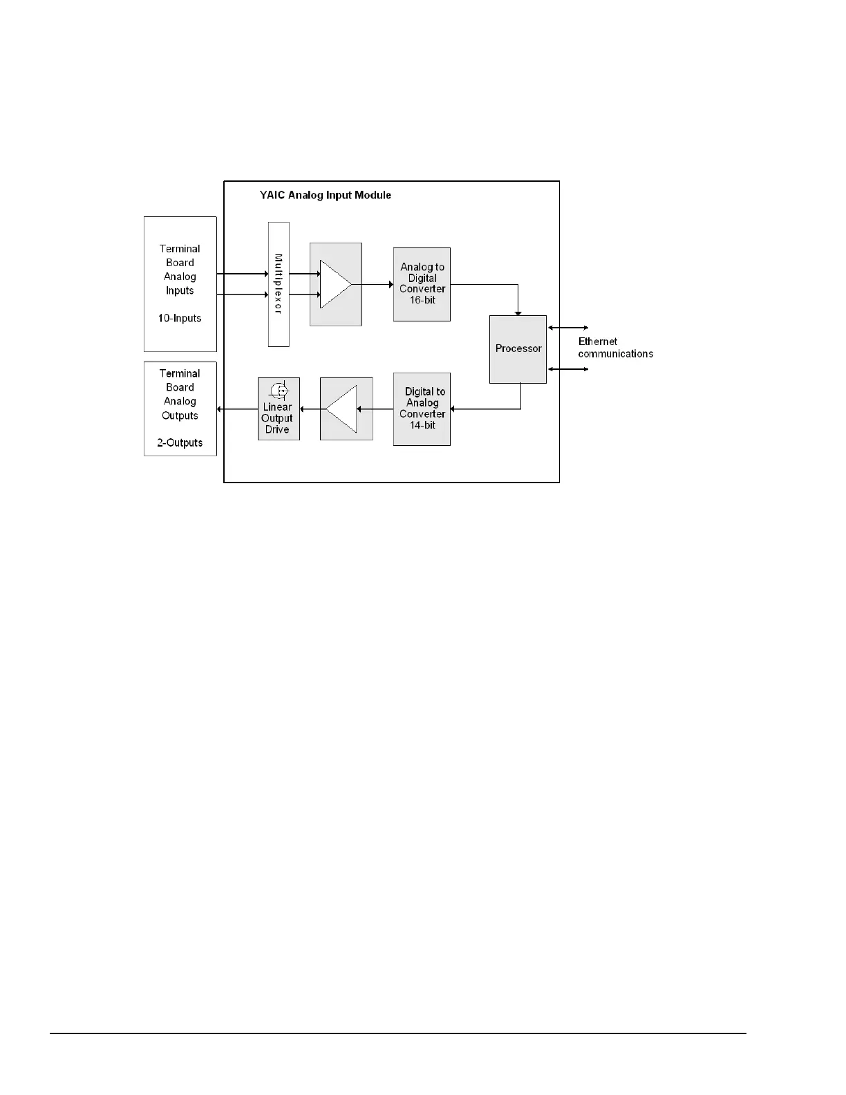 The YAIC accepts input voltage signals from the terminal board for all 10 input channels. The analog input section consists of