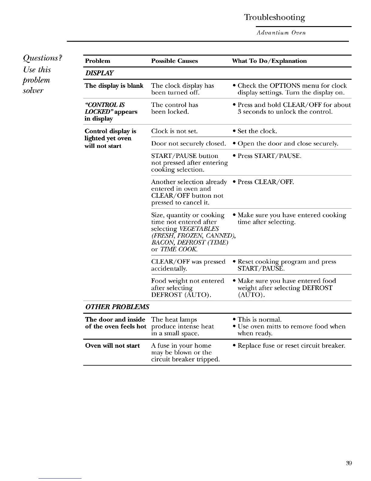 Problem Possible Causes What To Do/Explanation