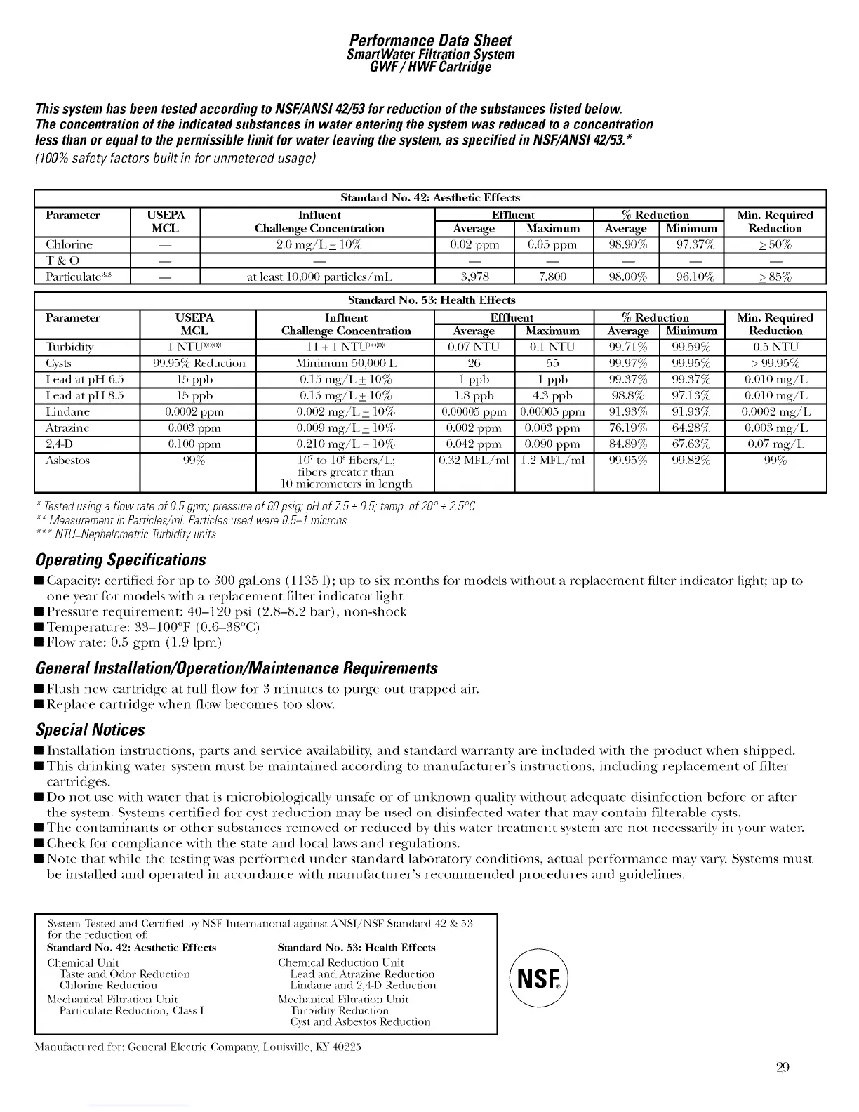 System Tested and Certified by NSF International against ANSI/NSF Standard 42 & 53