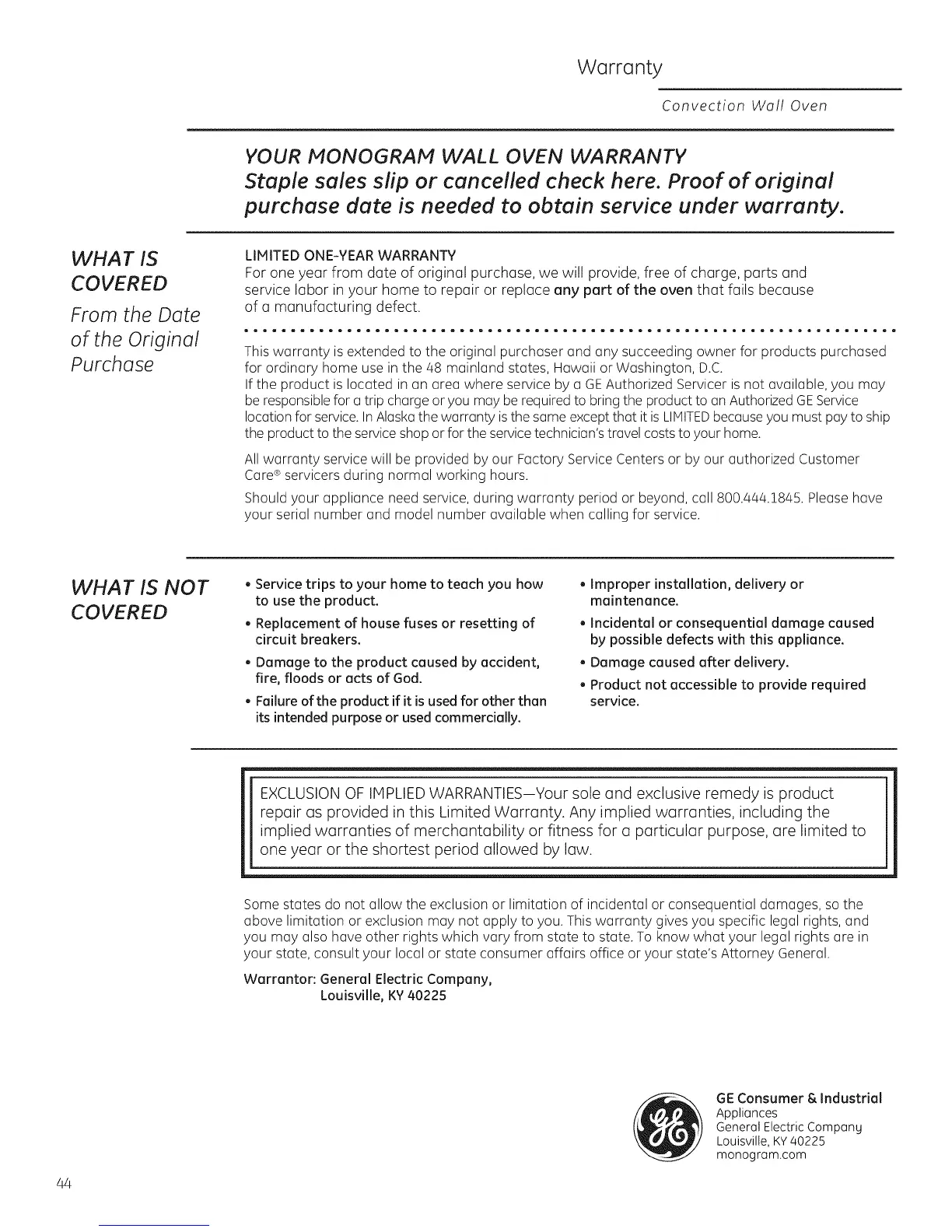 YOUR MONOGRAM WALL OVEN WARRANTY