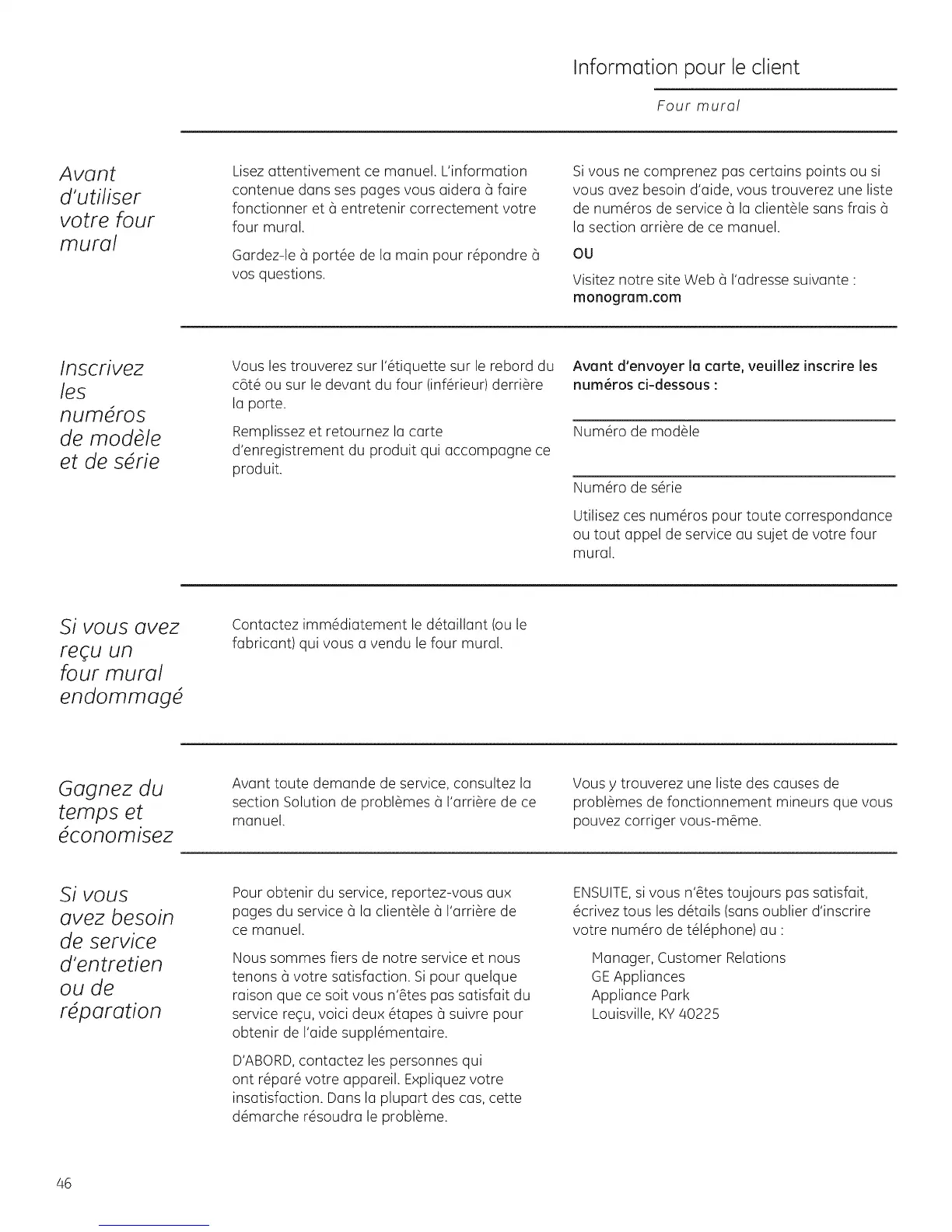 ou tout appel de service au sujet de votre four