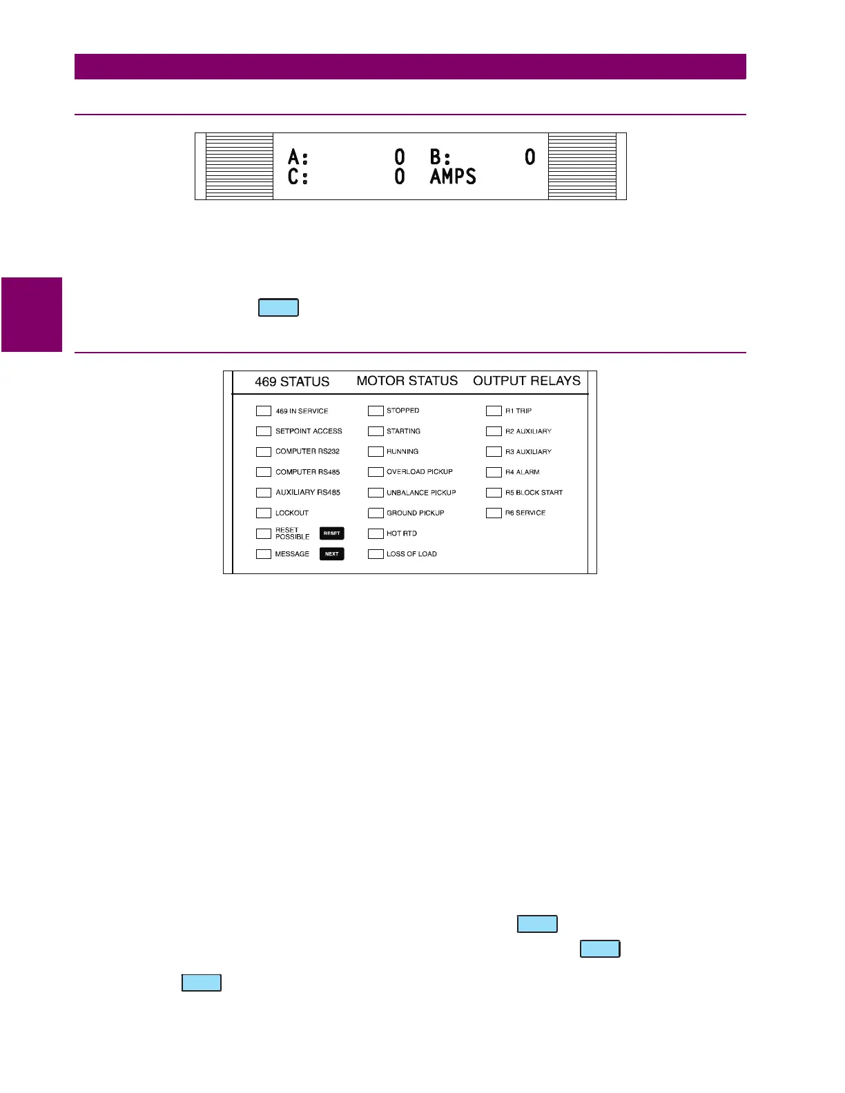 There are three groups of LED indicators. They are 469 Status, Motor Status, and Output Relays.