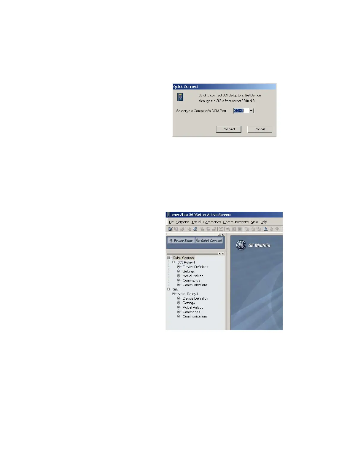 As indicated by the window, the Quick Connect feature quickly connects the EnerVista 369