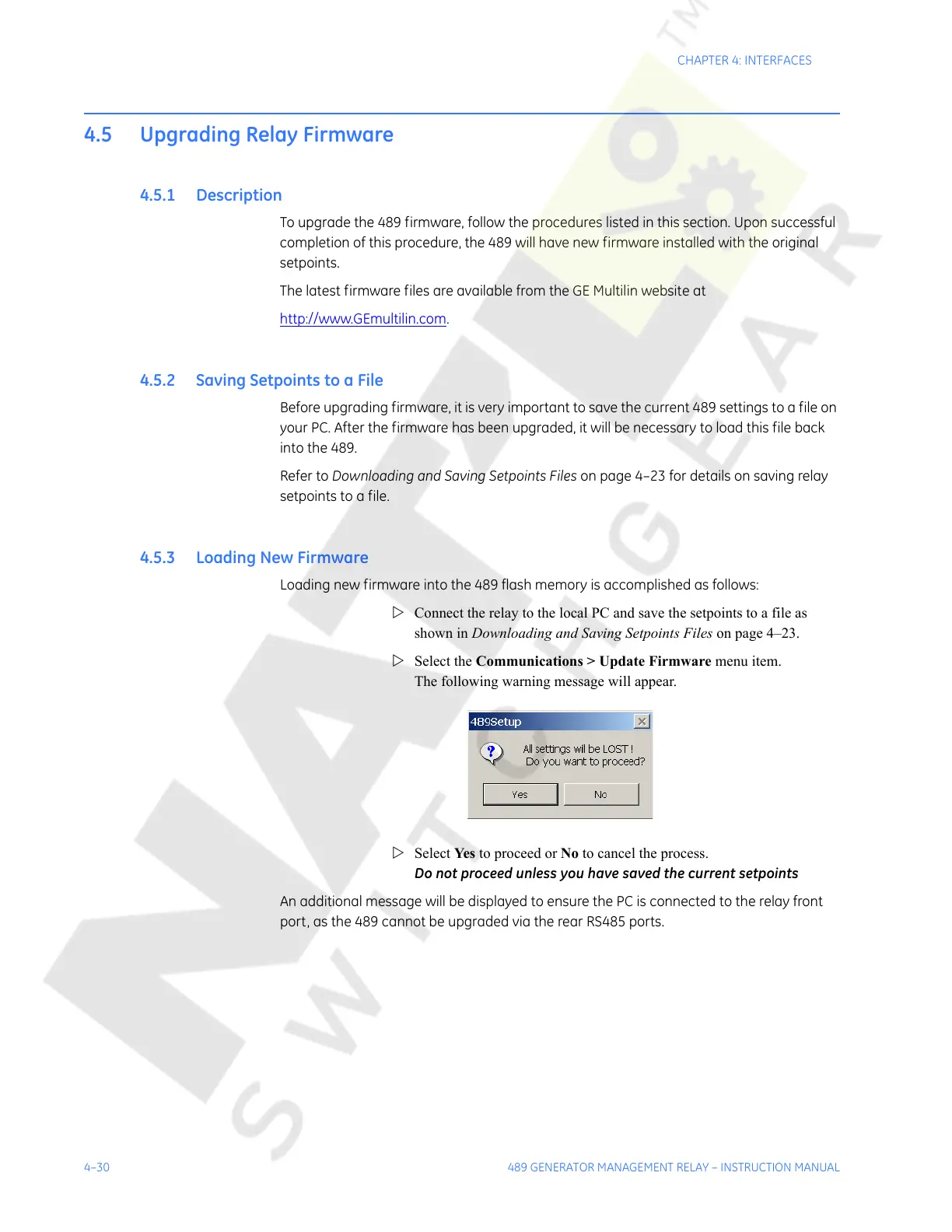 Before upgrading firmware, it is very important to save the current 489 settings to a file on