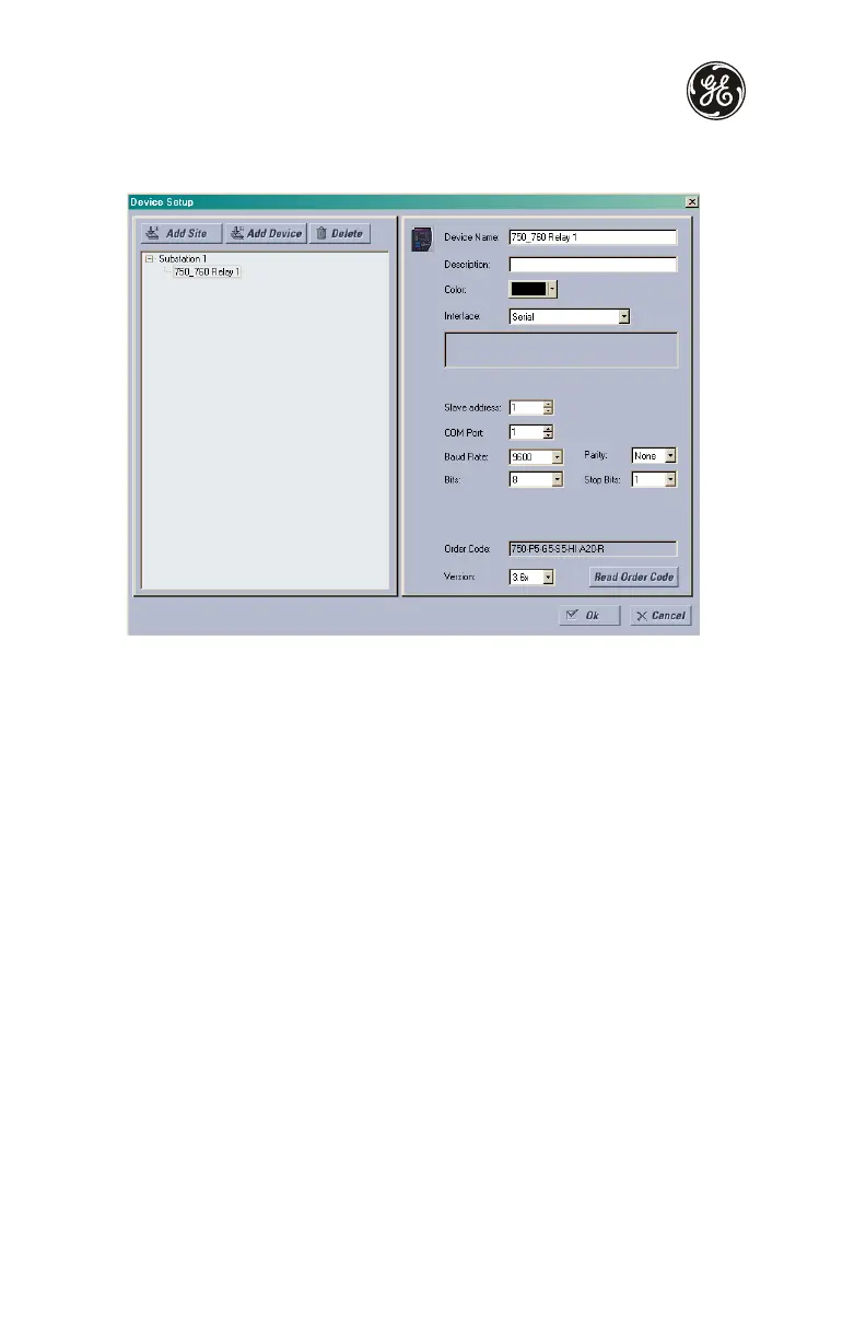 8. Click the Read Order Code button to connect to the 750/760 device and upload the