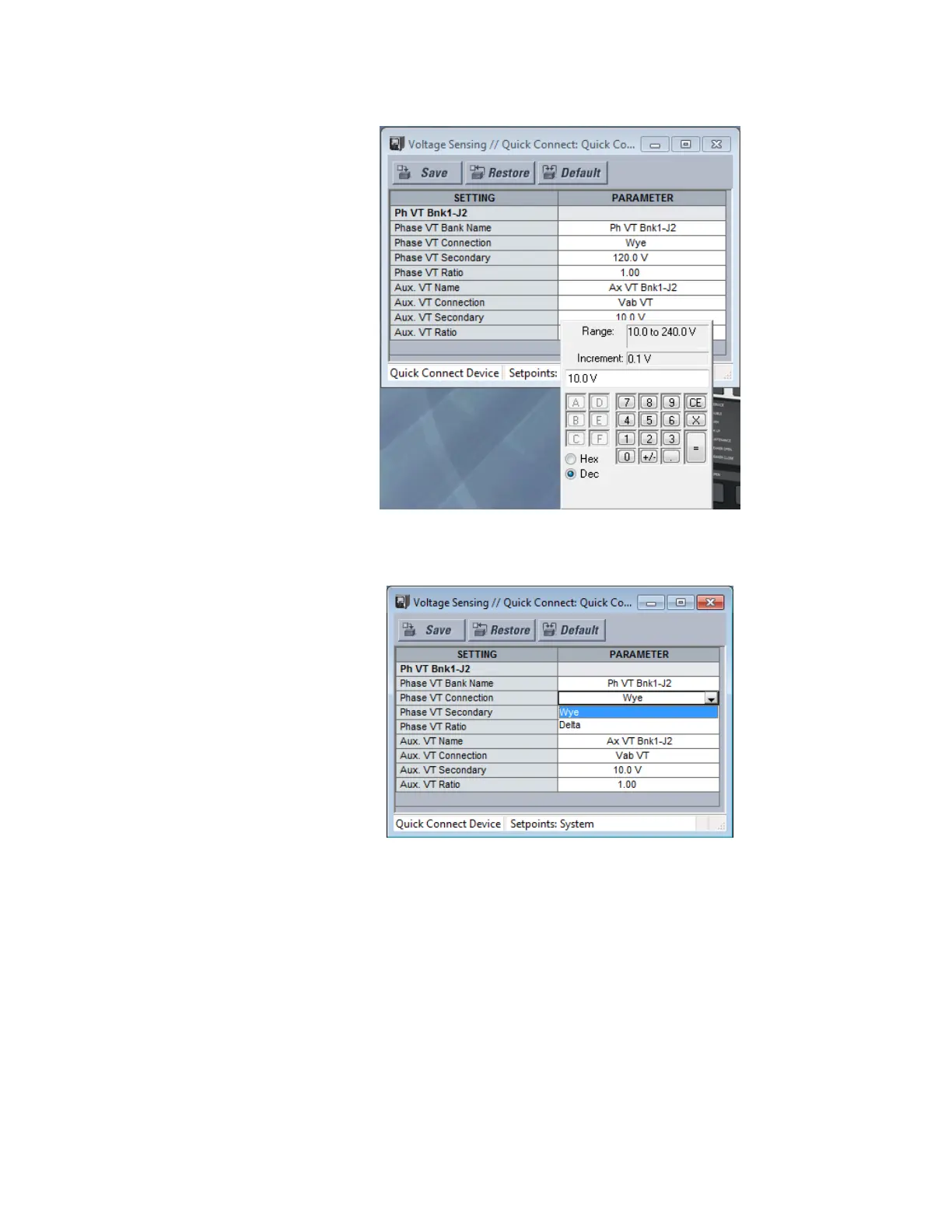 5. For setpoints requiring non-numerical pre-set values (e.g. Phase VT Connection