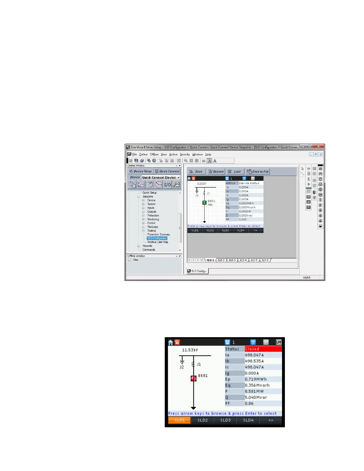 Single line diagrams (SLD) are viewed from the relay front panel and individual SLD pages