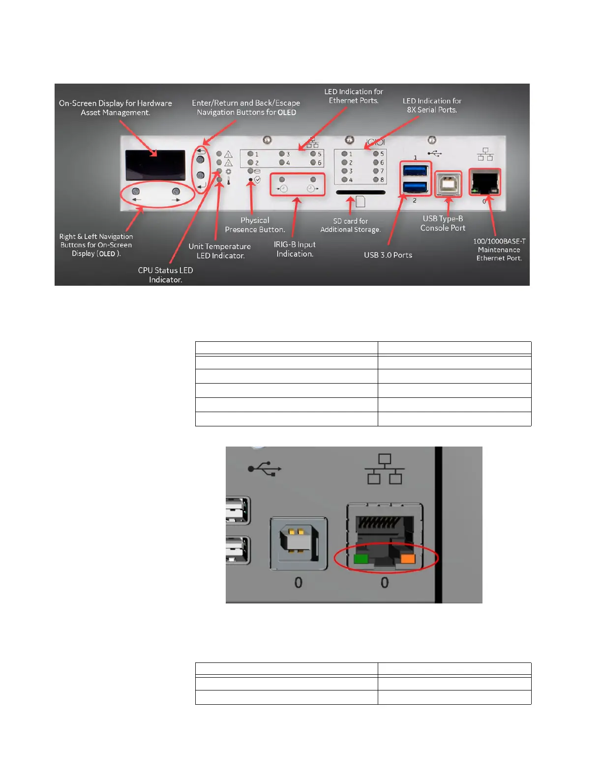 Orange and green LEDs located on the front of the unit in the Ethernet connector housing