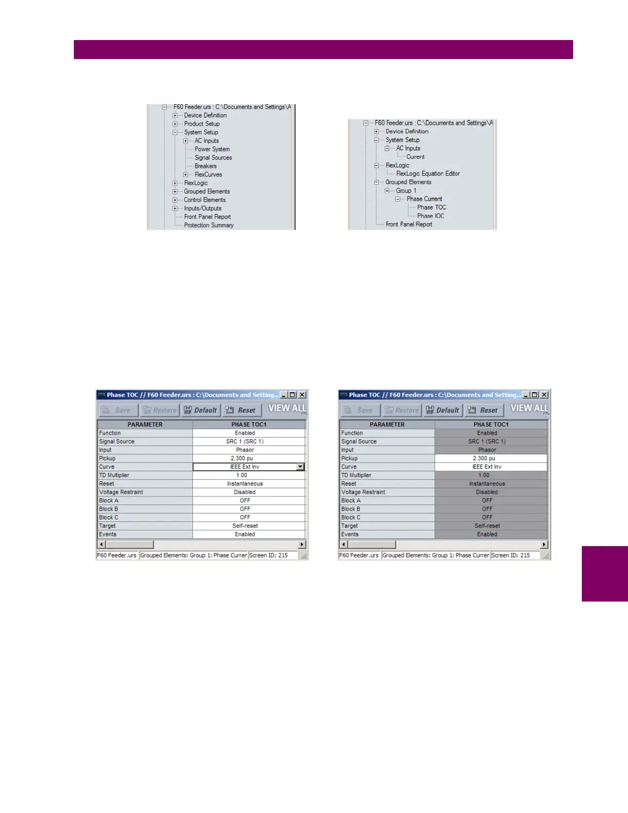Phase time overcurrent settings window without template applied. Phase time overcurrent window with template applied via