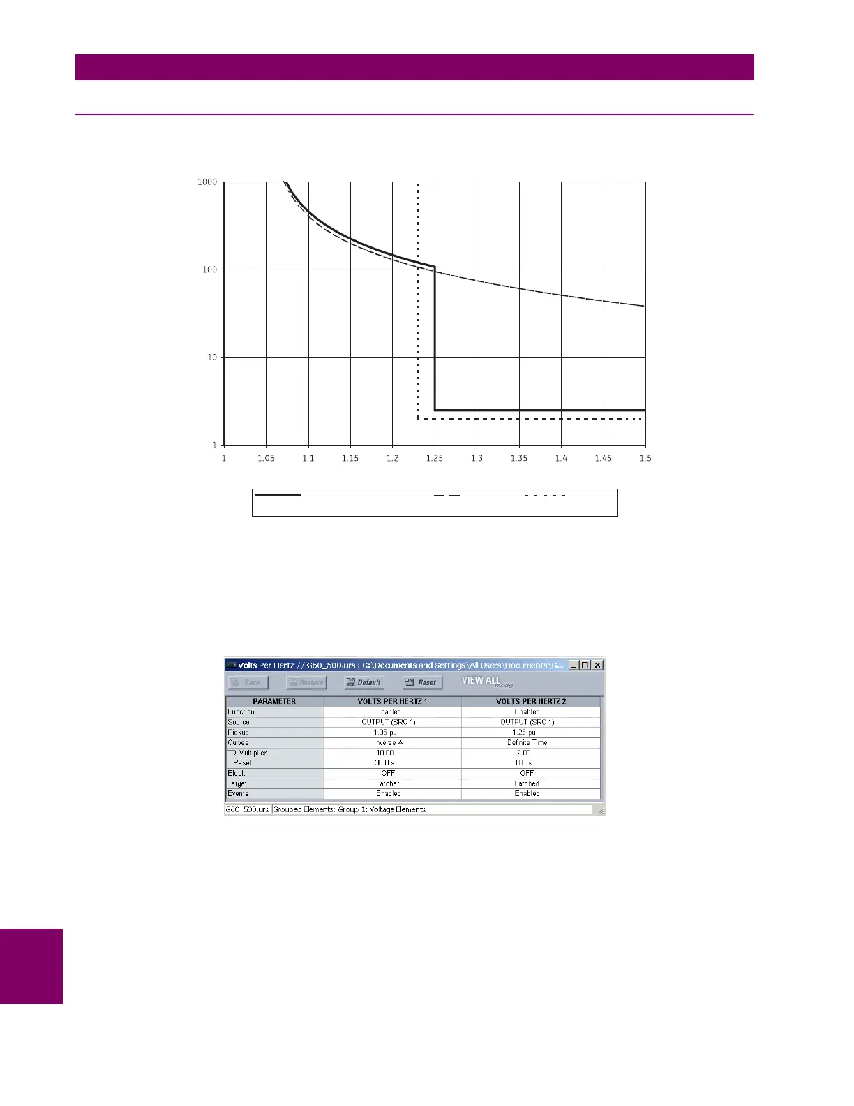 the volts per hertz 2 element with a definite time characteristic, a pickup of 1.23, and a time delay of 2 seconds. Both ele-