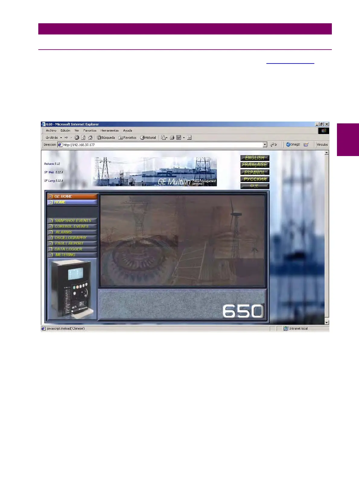 The web server in the G650 can be accessed running the Windows explorer, and keying http://xxx.xxx.xx.xxx