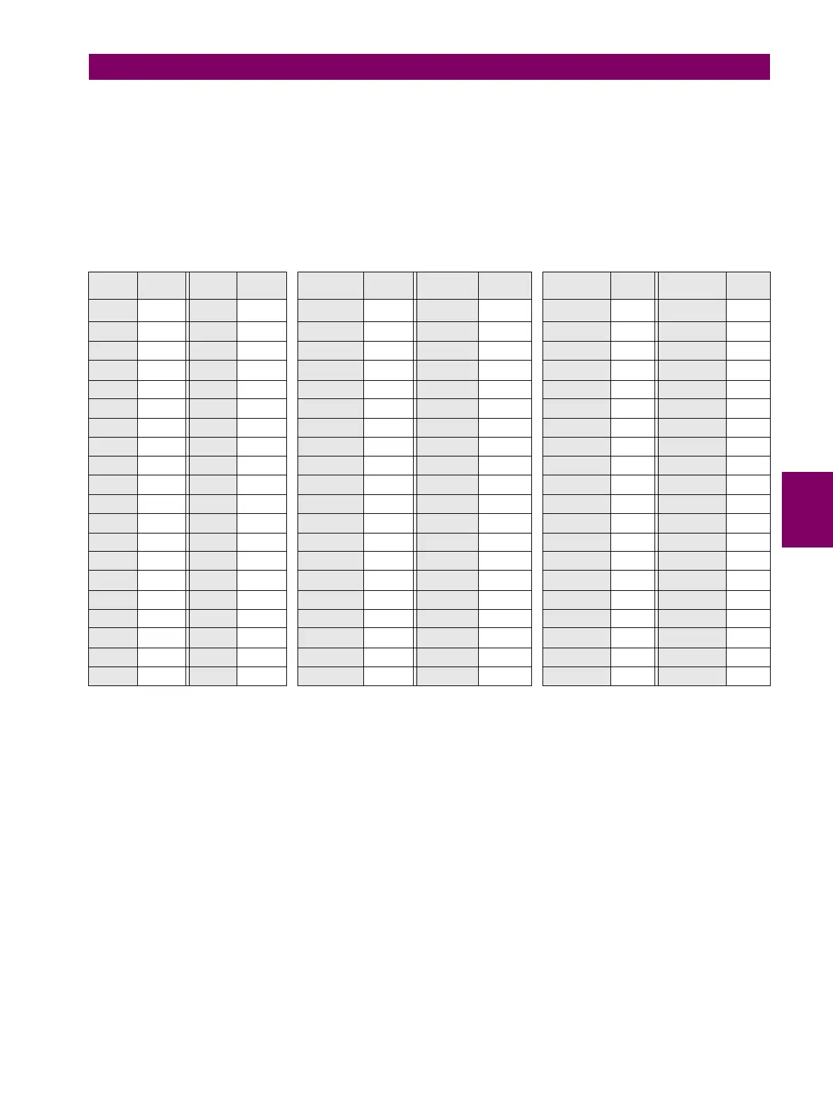 The following table details the 120 points as well as the characteristic for each of them, and a blank cell where the user can