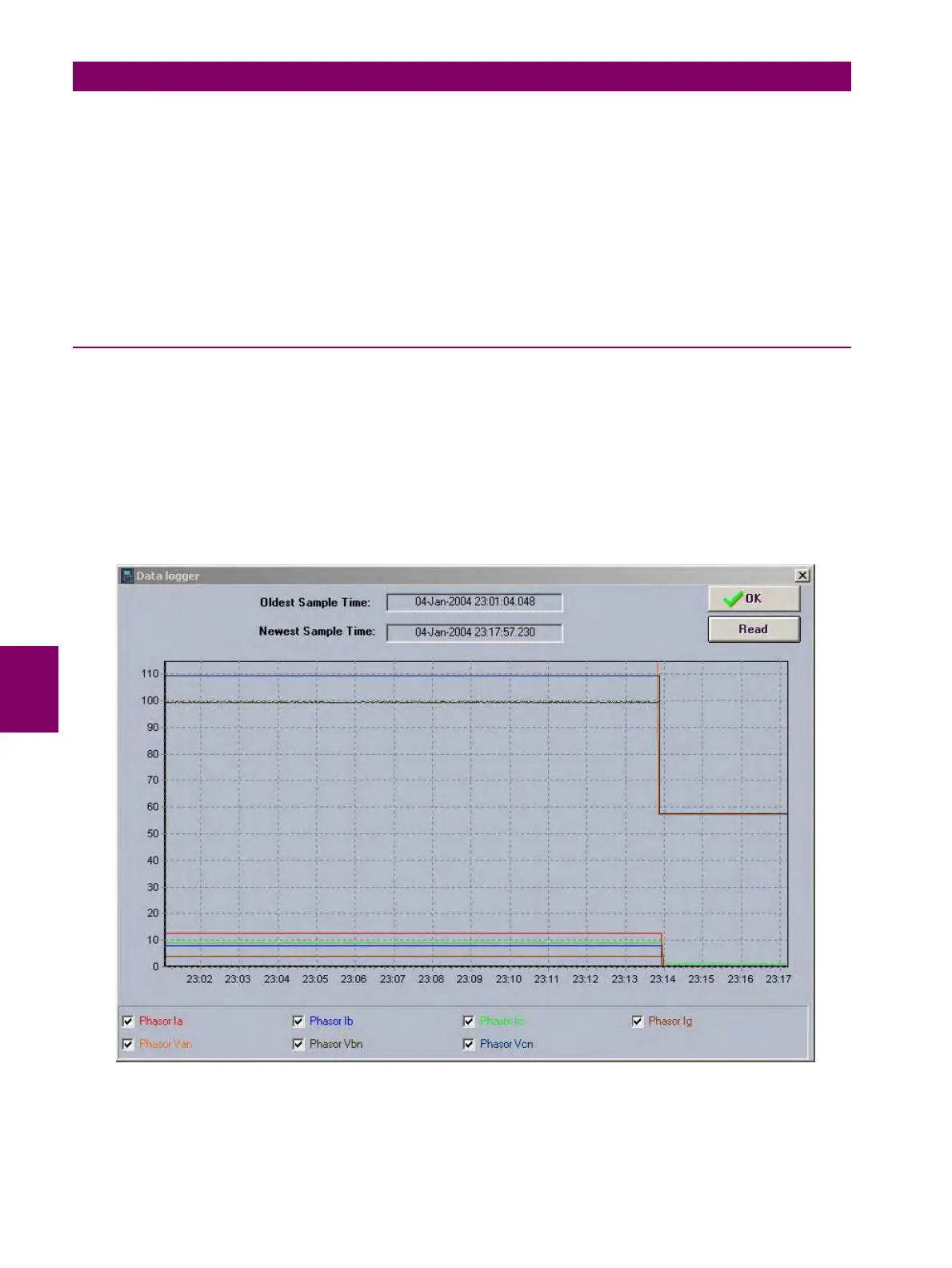 information monitored by the relay according to the settings adjusted at “Setpoint > Product Setup > Data Logger”, where