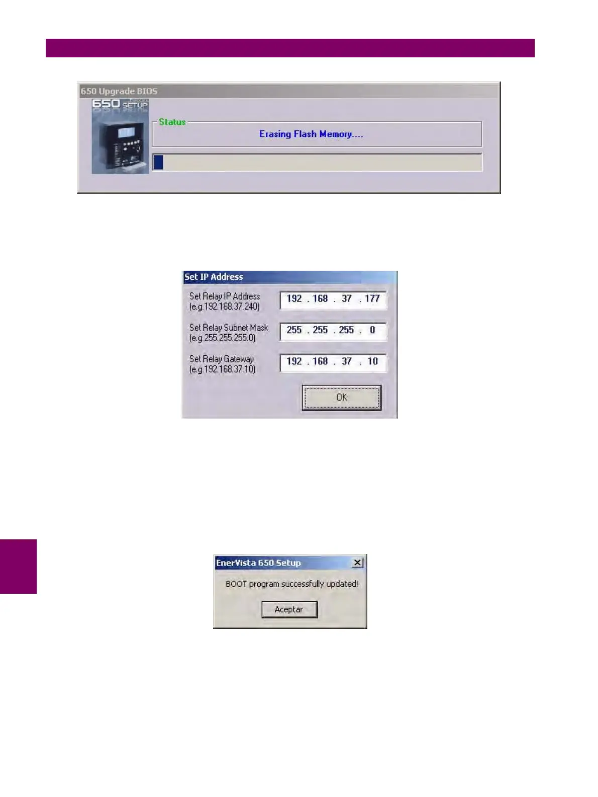 Once the memory has been erased and the files upgraded in the relay, the parameters for the Ethernet communications