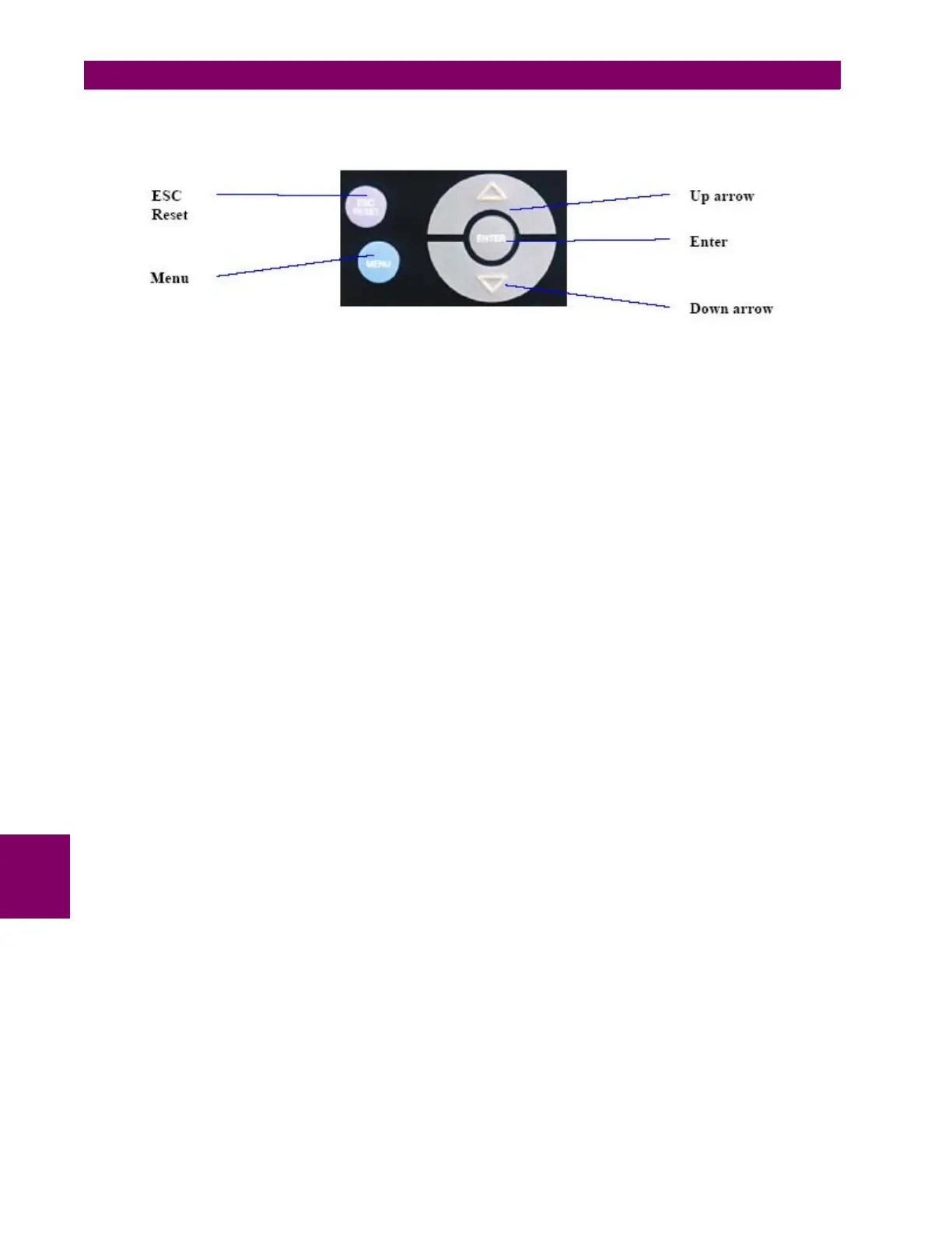 menu structure using Up and Down arrows to move horizontally, Enter to enter submenus and Escape to exit to the