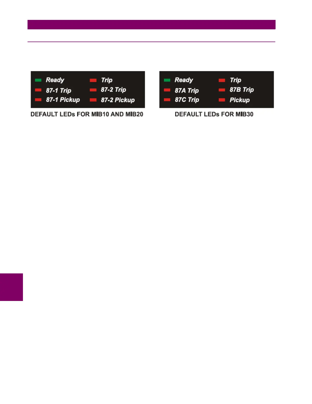 The faceplate of the MIB relay has six LEDs that show the relay status, as well as pickup and trip status. LEDs are