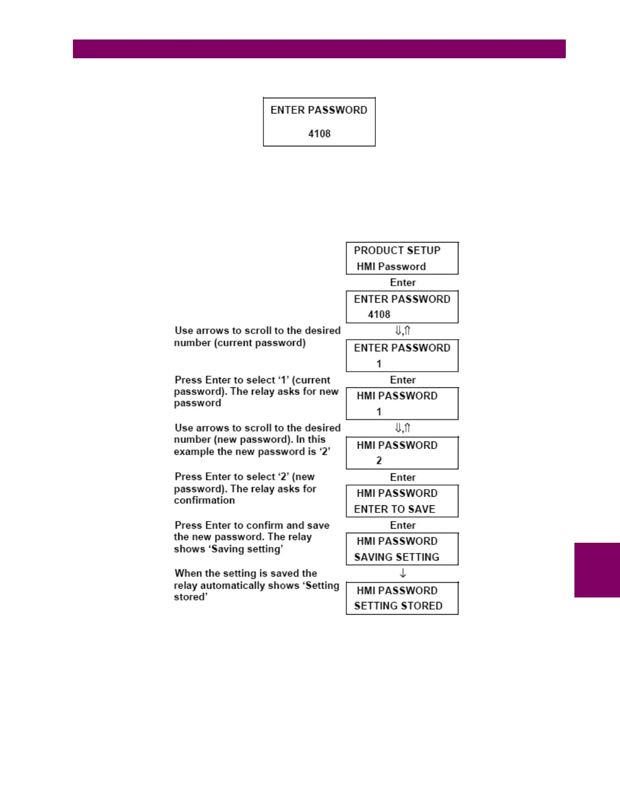 the current password. Once it has been entered, the relay asks for the new password. Here is an example of how to