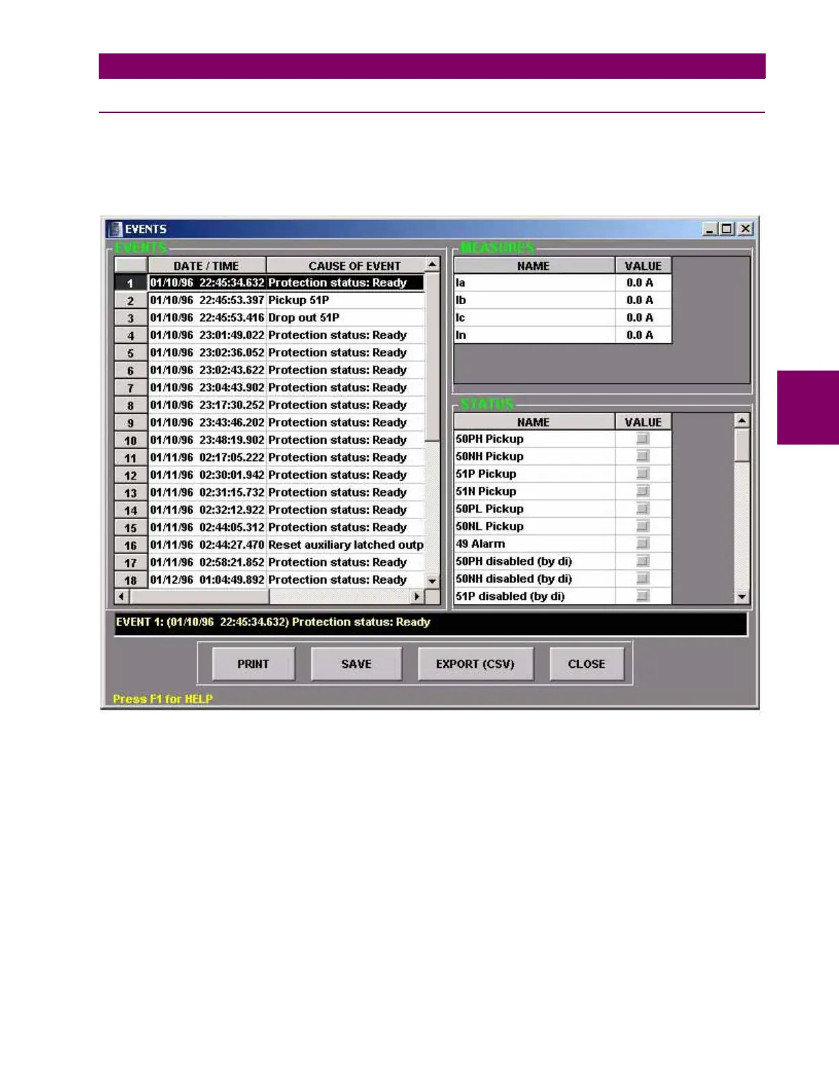(pickup, trip of a certain function, etc.), and a list of the status of all inputs, outputs and functions during the event.