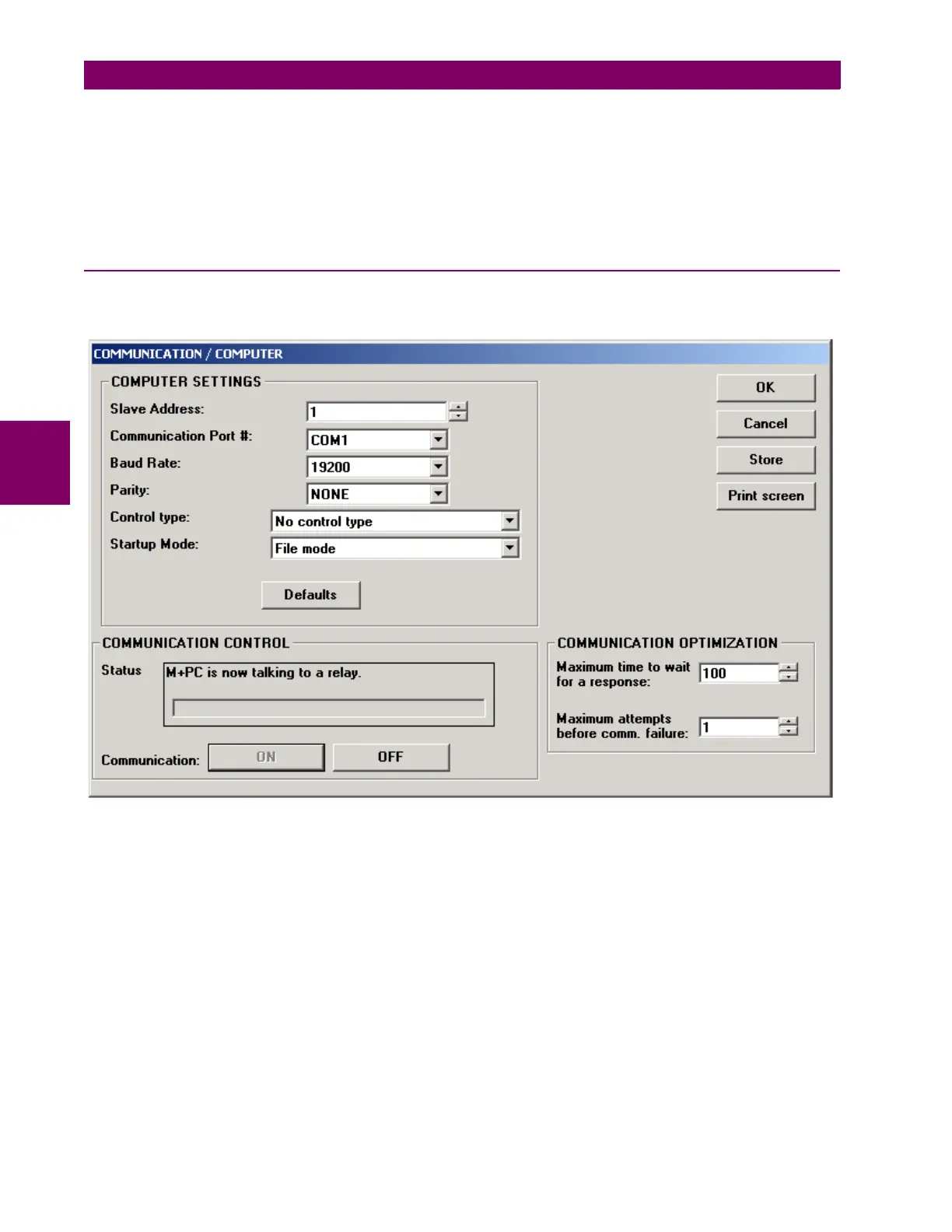 In COMPUTER dialog the user can configure the necessary adjustments to communicate with the relay from a PC.