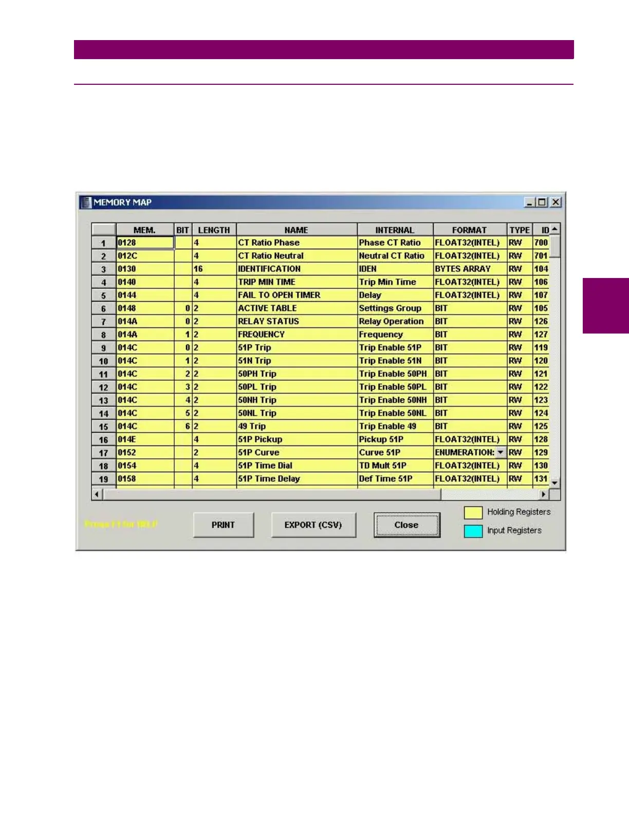 With MODBUS MEMORY MAP option the user can extract the complete memory map from the relay and print or save it