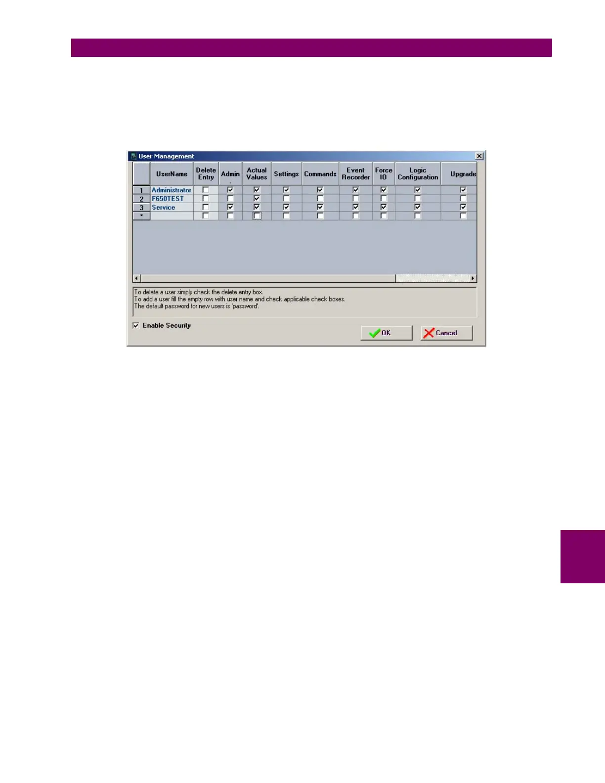 EnerVista 650 Setup Security Control is disabled by default. Users don't have to log in through user name and password