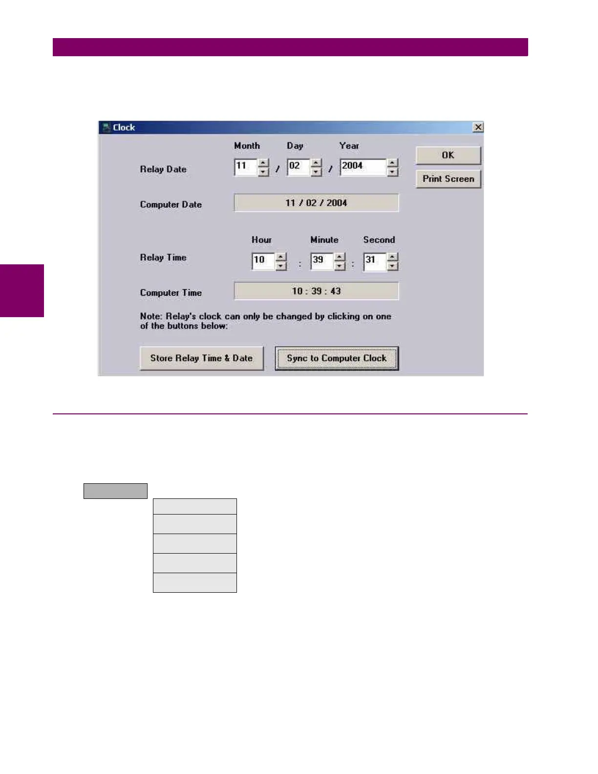 This menu allows to update the date and time of the relay, either synchronizing them with the PC clock, or entering the