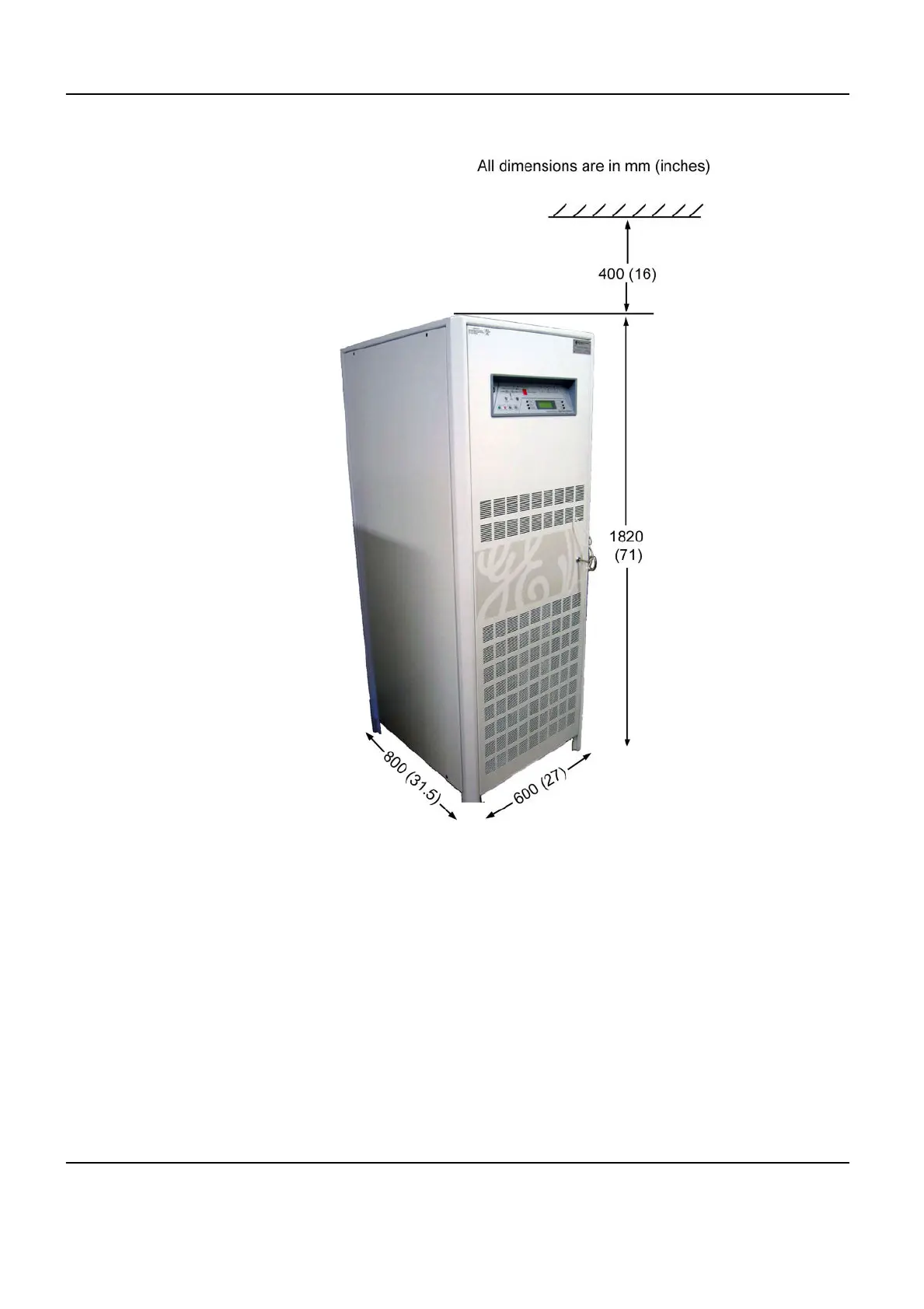 Recommended minimum clearance between ceiling and top of the UPS should be 400 mm (16”)