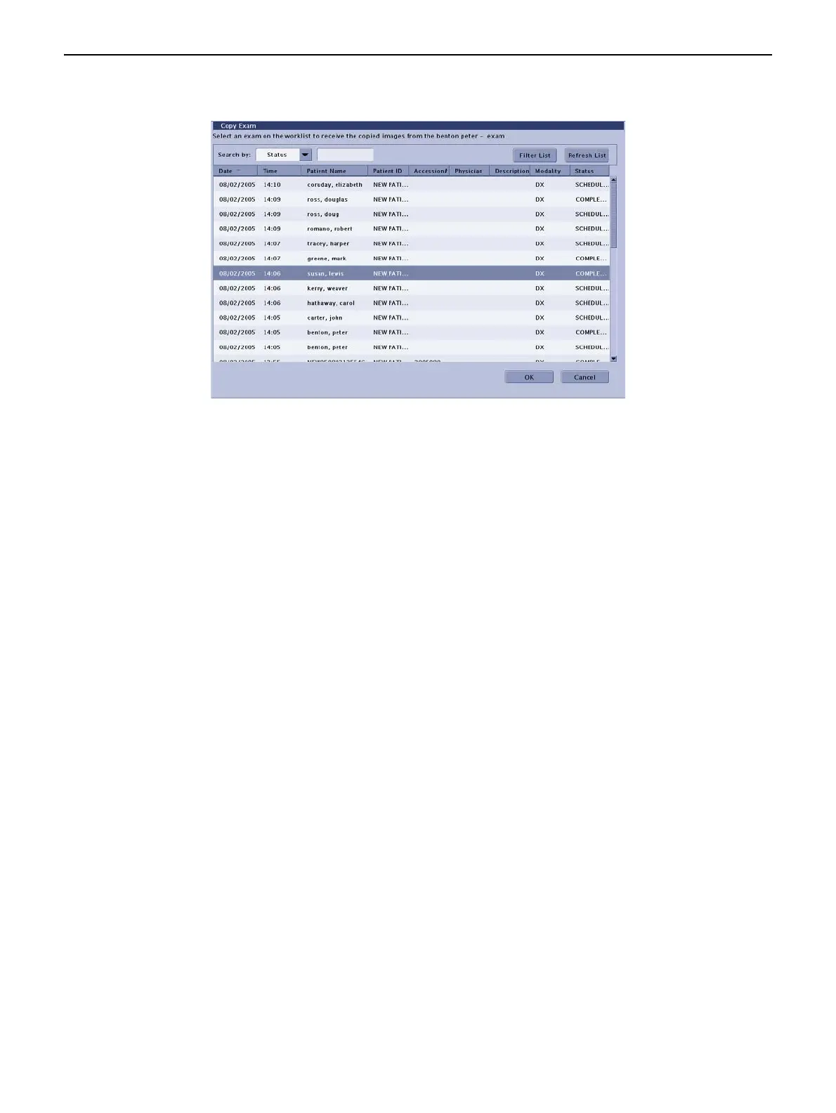 The Copy Exam screen shows all Worklist entries with the status of “Scheduled”, “Discontinued”, or