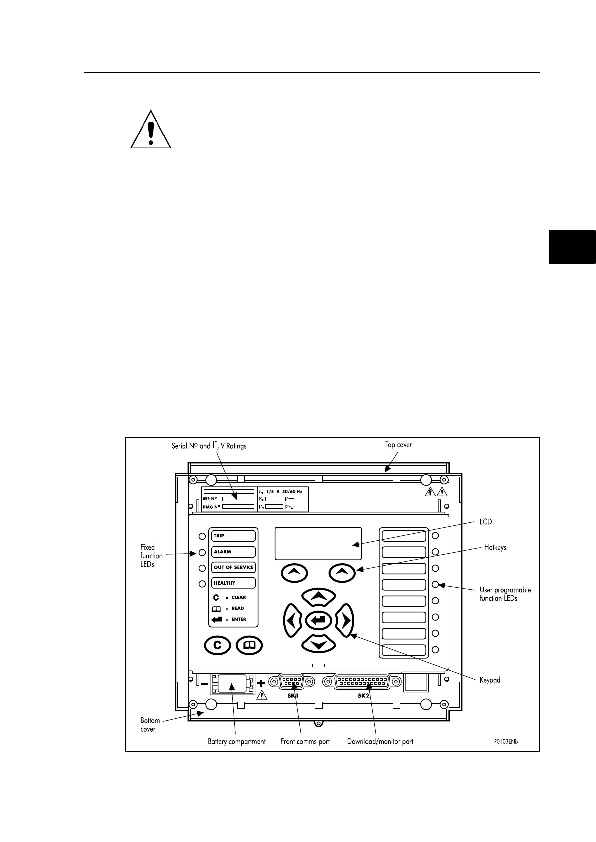 The front panel of the relay is shown in Figure 1 (P742) or 2 (P741 or P743), with the hinged