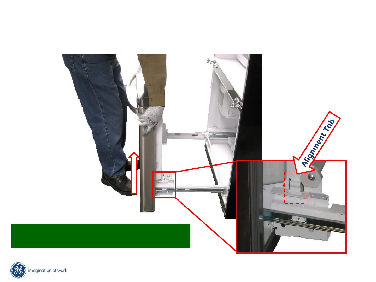 Lift the drawer front off of the slides – releasing the two tabs from the slide tab slots.
