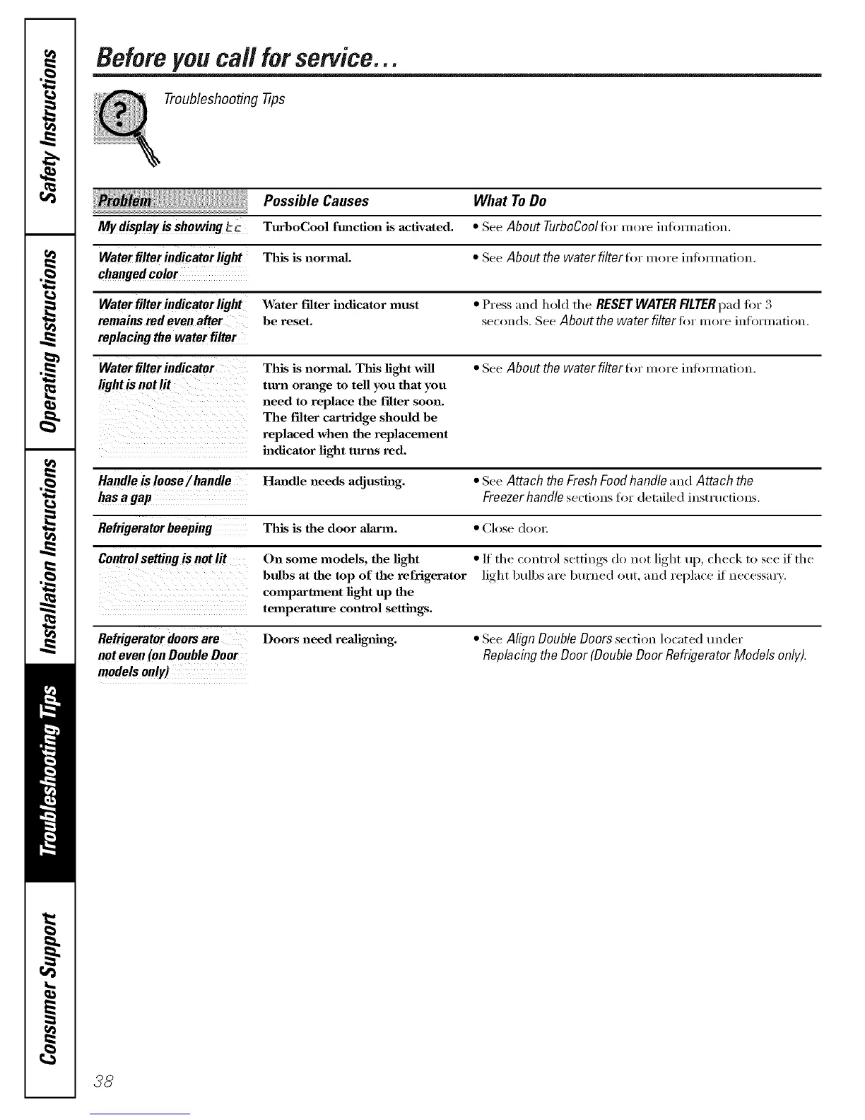 Waterfilterindicatorlight Water filter indicator must • Pressand hold the RESETWATERFILTERpadfor 3