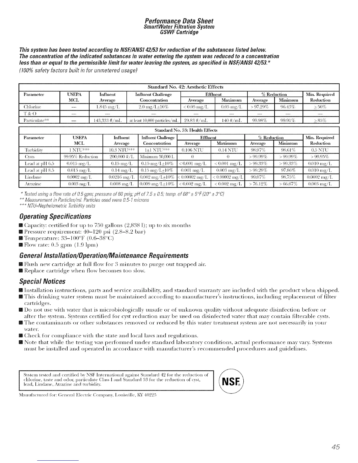 Thissystemhas been testedaccordingto NSF/ANS142/53forreductionofthesubstances listed below.