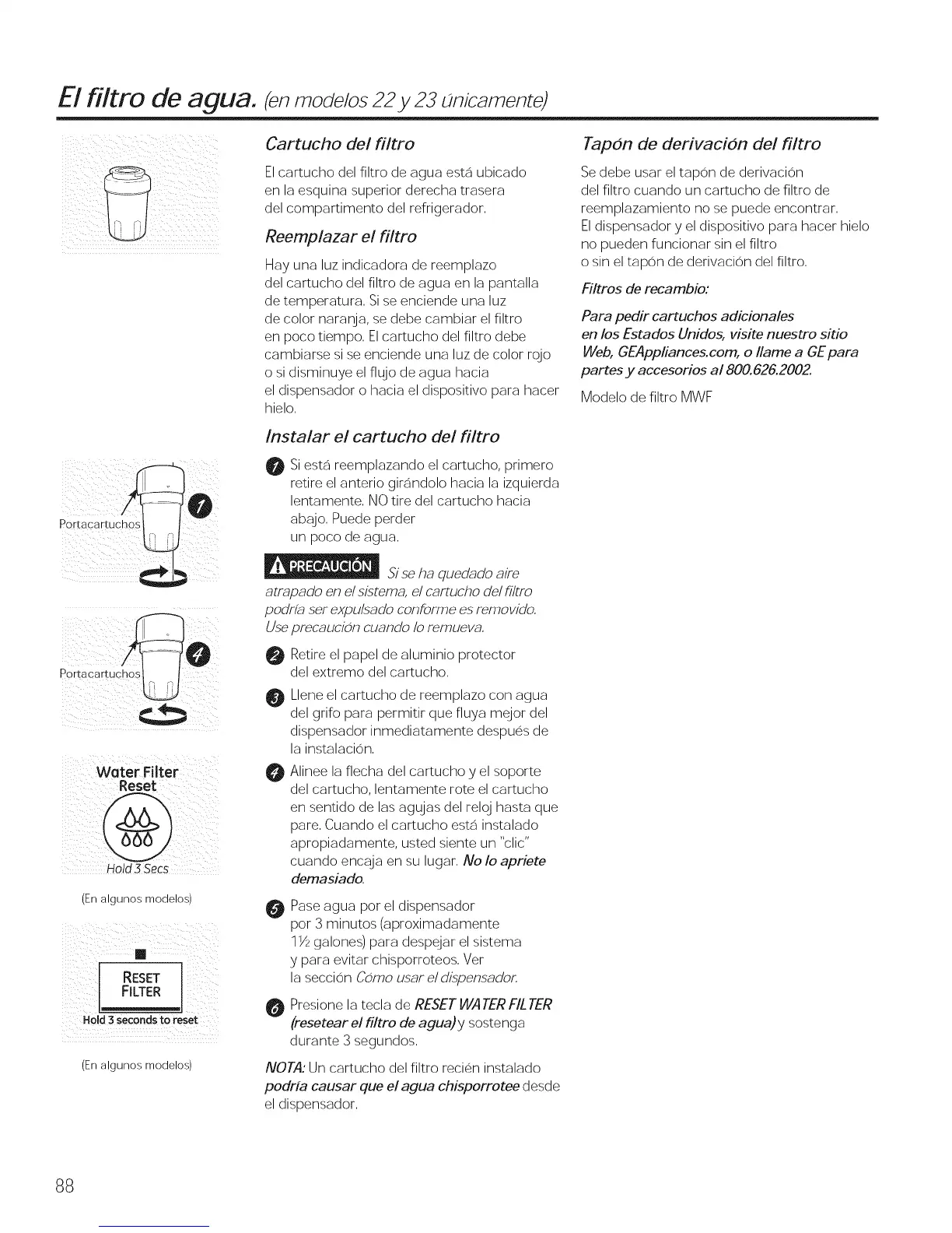 (resetear el fi/tro de agua)y sostenga