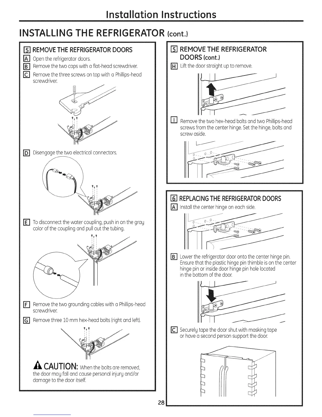 r_ Lowerthe refrigerator door onto the center hinge pin.
