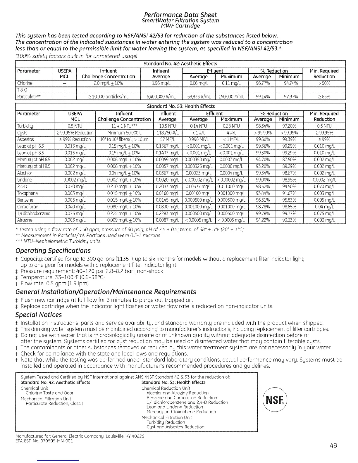 Tested using a flow rate of 0.50 gpm; pressure of 60 psig; pH of 7.5 +_0.5; temp. of 68 ° +_5°F (20 °+_3°C)