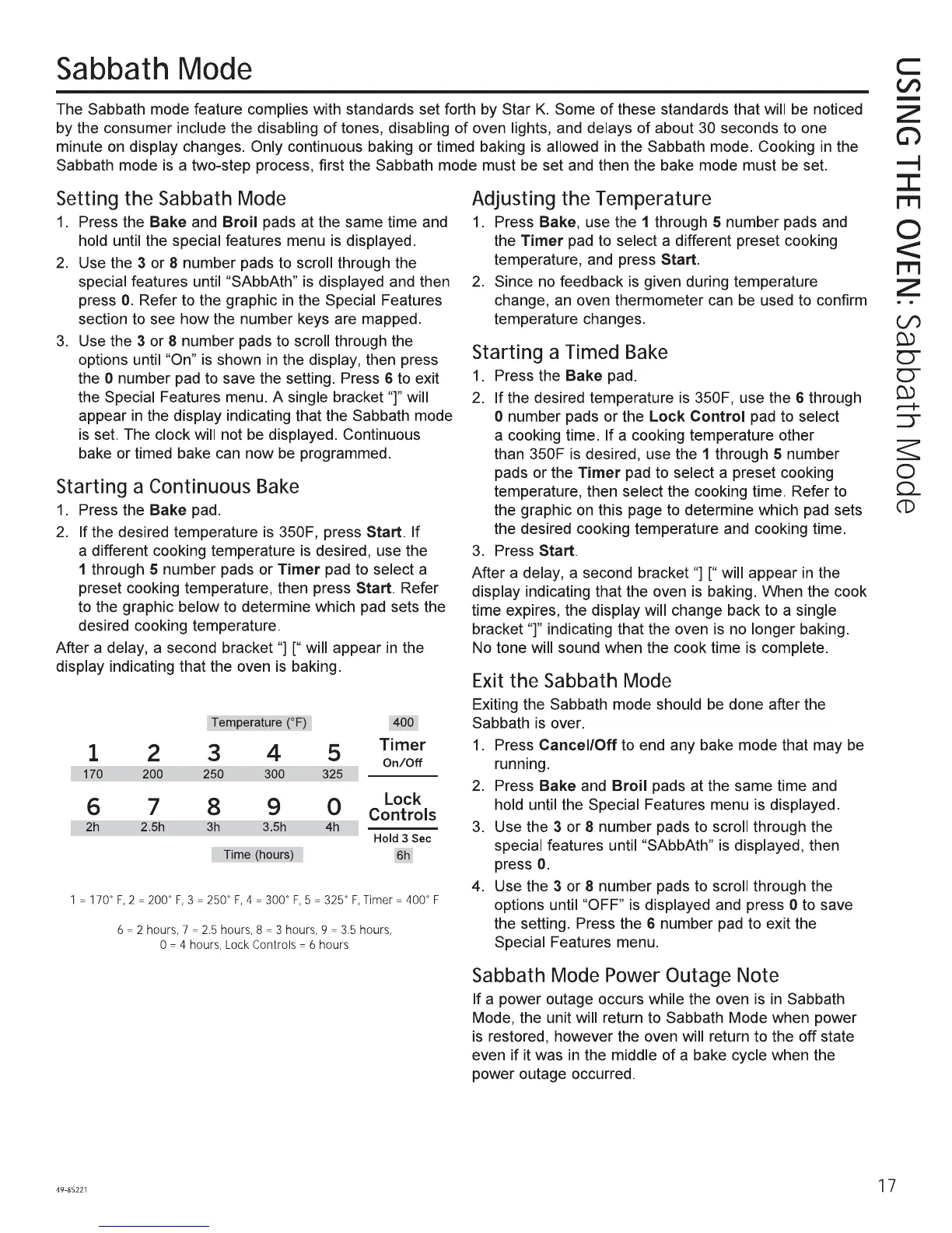 GE PGB911SEJSS - Setting the Sabbath Mode; Starting a Continuous Bake; Adjusting the Temperature; Starting a Timed Bake