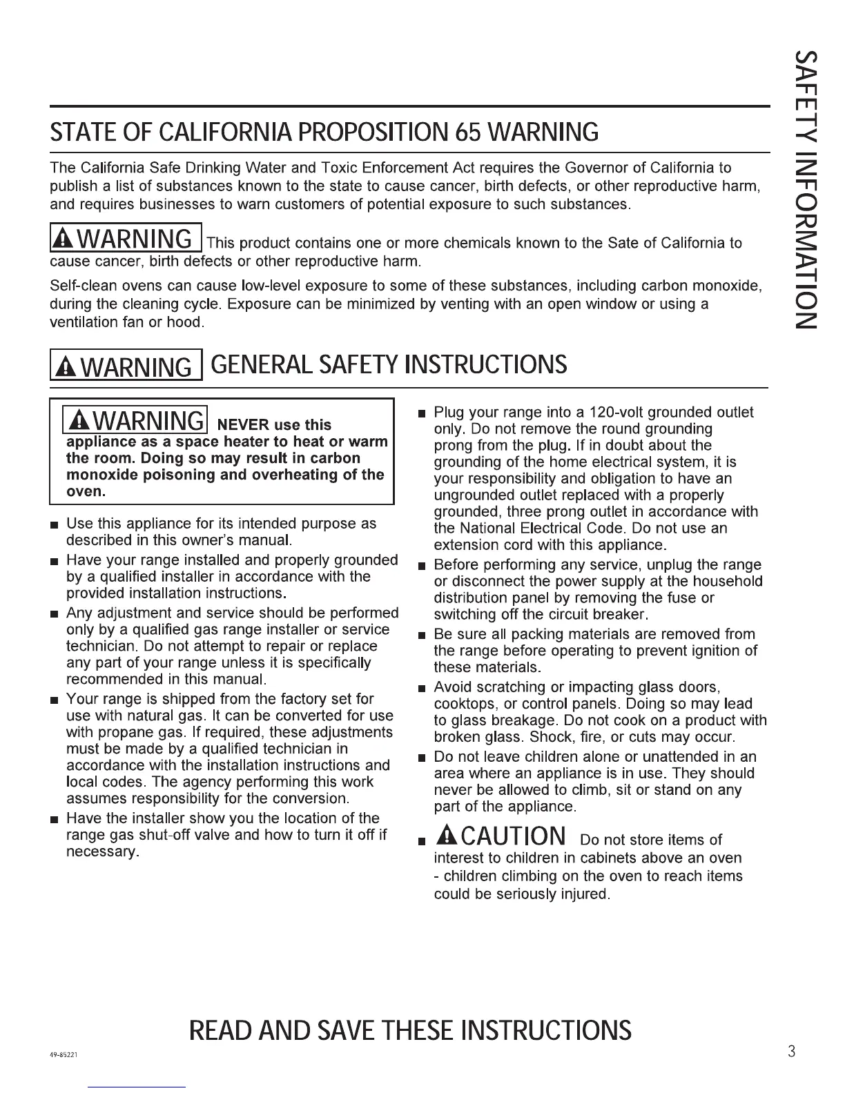 GE PGB911SEJSS - California Proposition 65 and General Safety; California Proposition 65 Warning; General Operating Safety and Fire Prevention