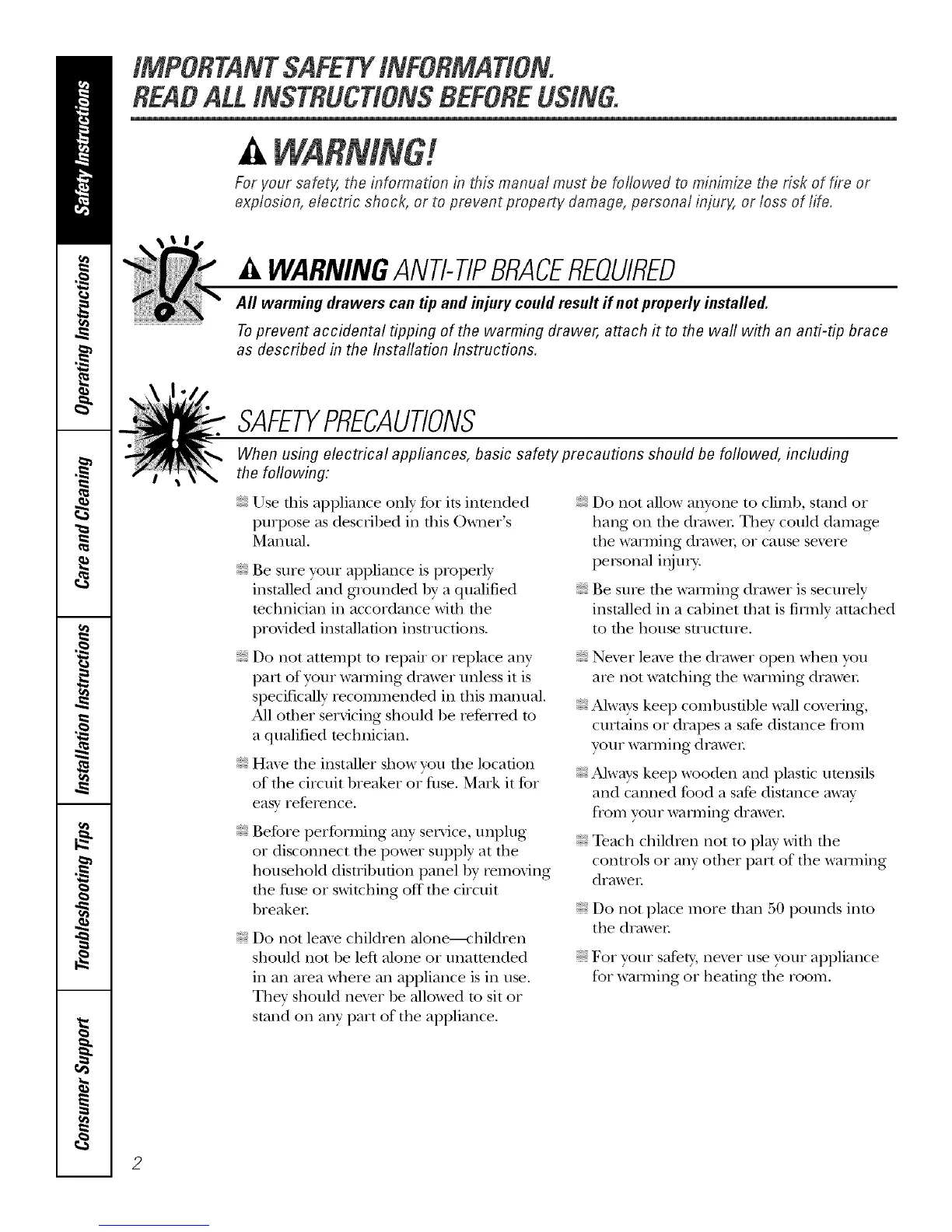 Toprevent accidental tipping of the warming drawer, attach it to the wall with an anti-tip brace