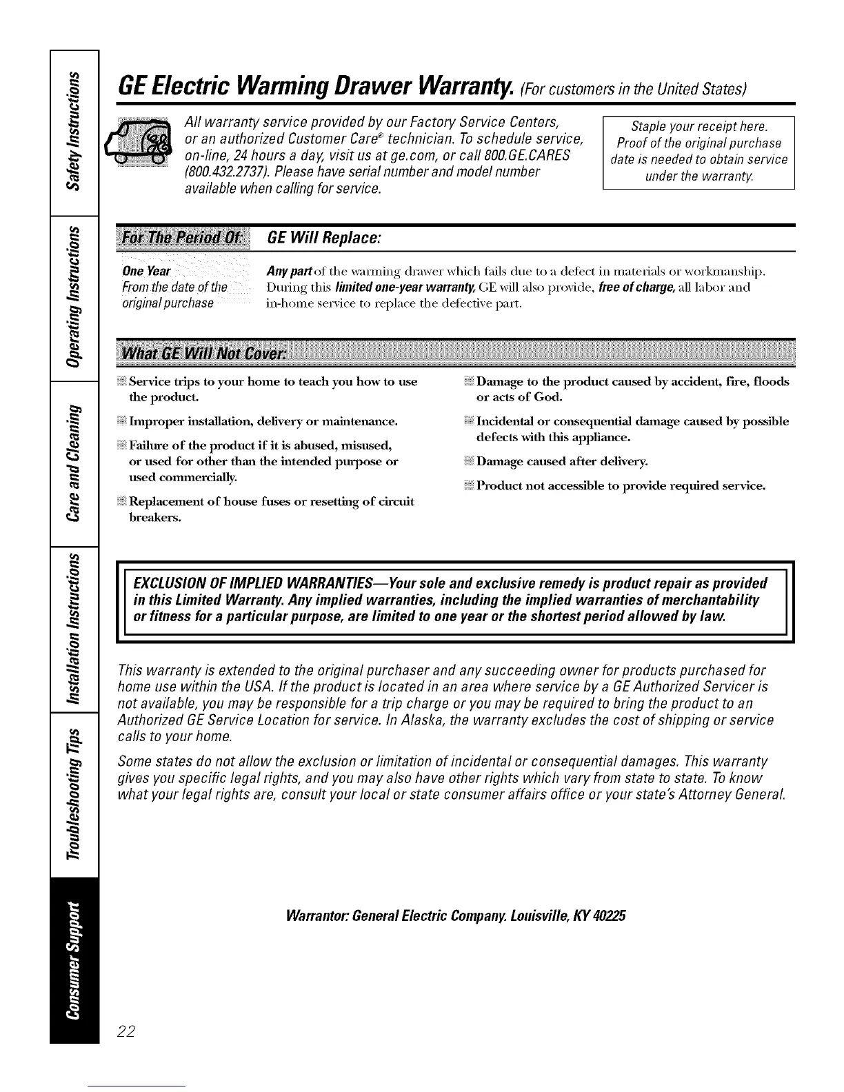 GEElectric WarmingDrawer Warranty.(Forc.stomersintheUnitedStates)