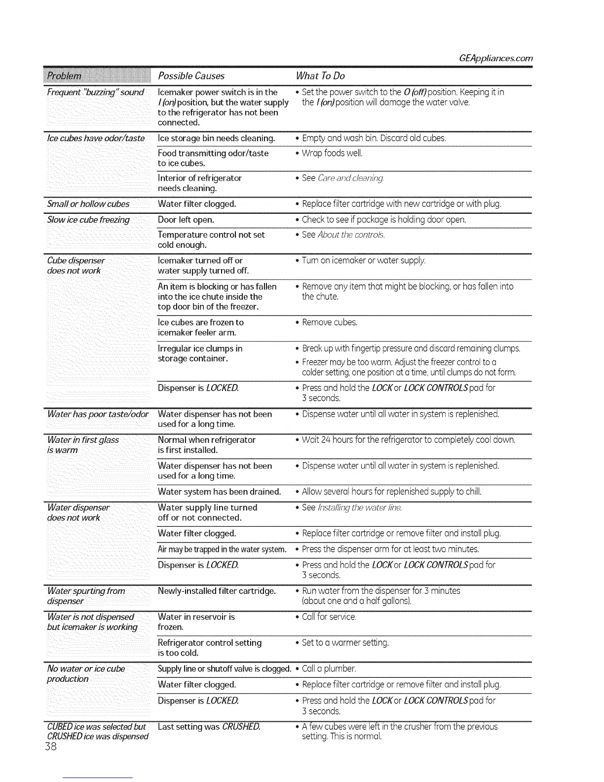 Smallor hollow cubes Water filter clogged. * Replacefilter cartridgewith newcartridge or with plug.