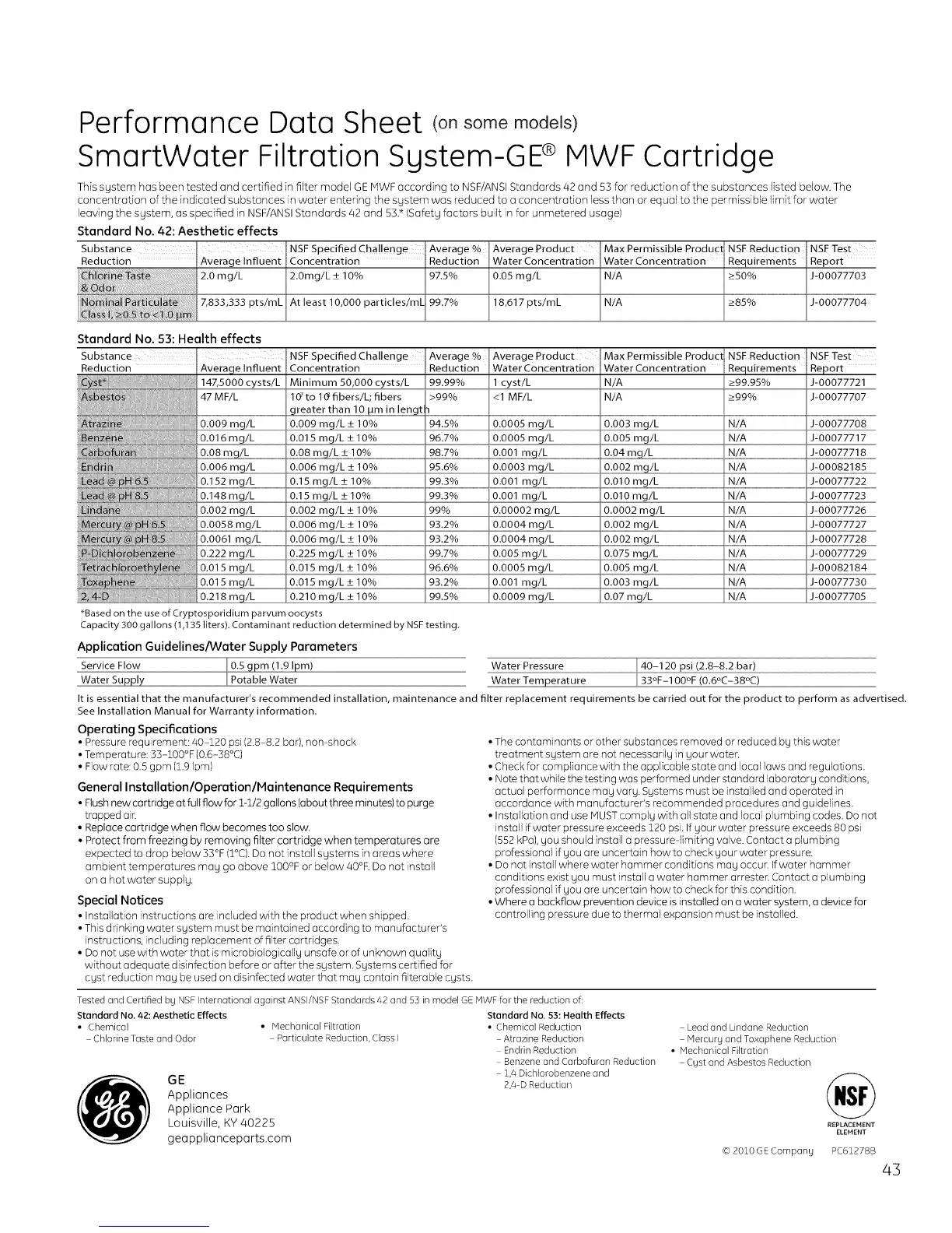 Thissgstem has been testedand certifiedinfiltermodel GE MWF according to NSF/ANSI Standards 42 and 53 farreductionofthe substances listedbelow, The