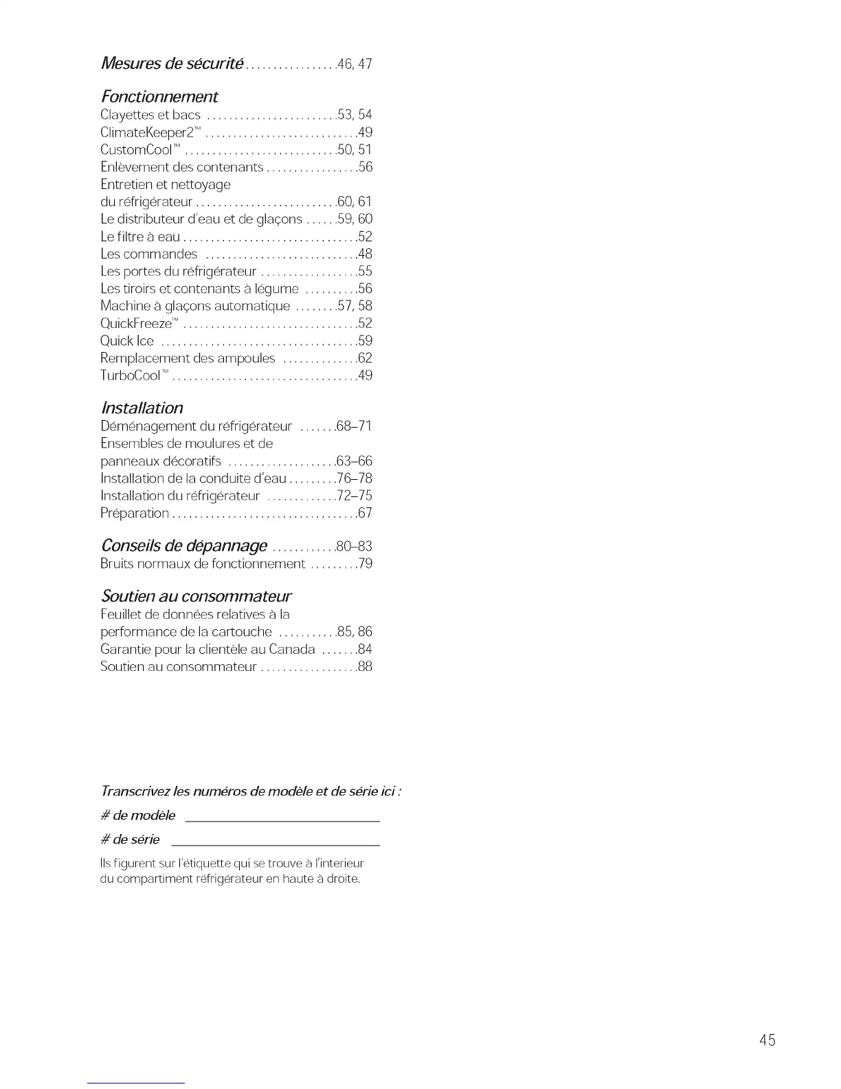 Le distributeur d'eau et de gla¢ons ...... 59, 60