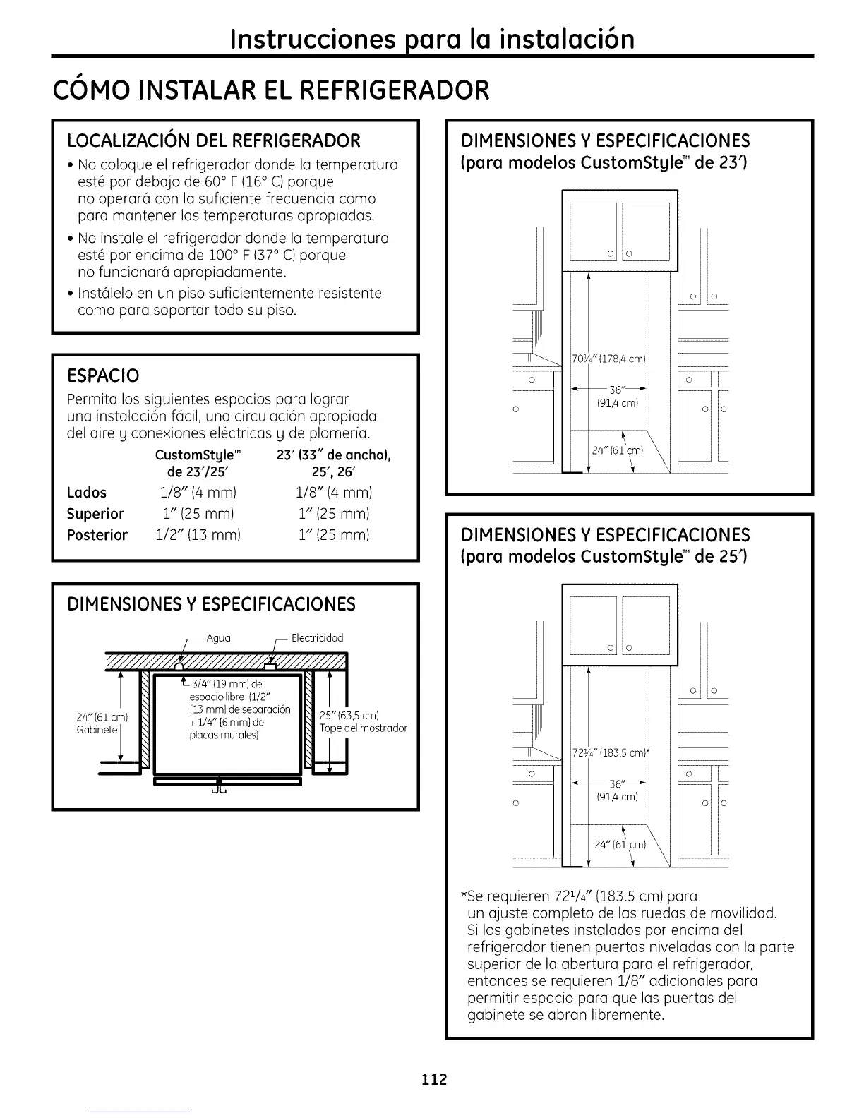 *Se requieren 721/4" (18:3.5 cm) para