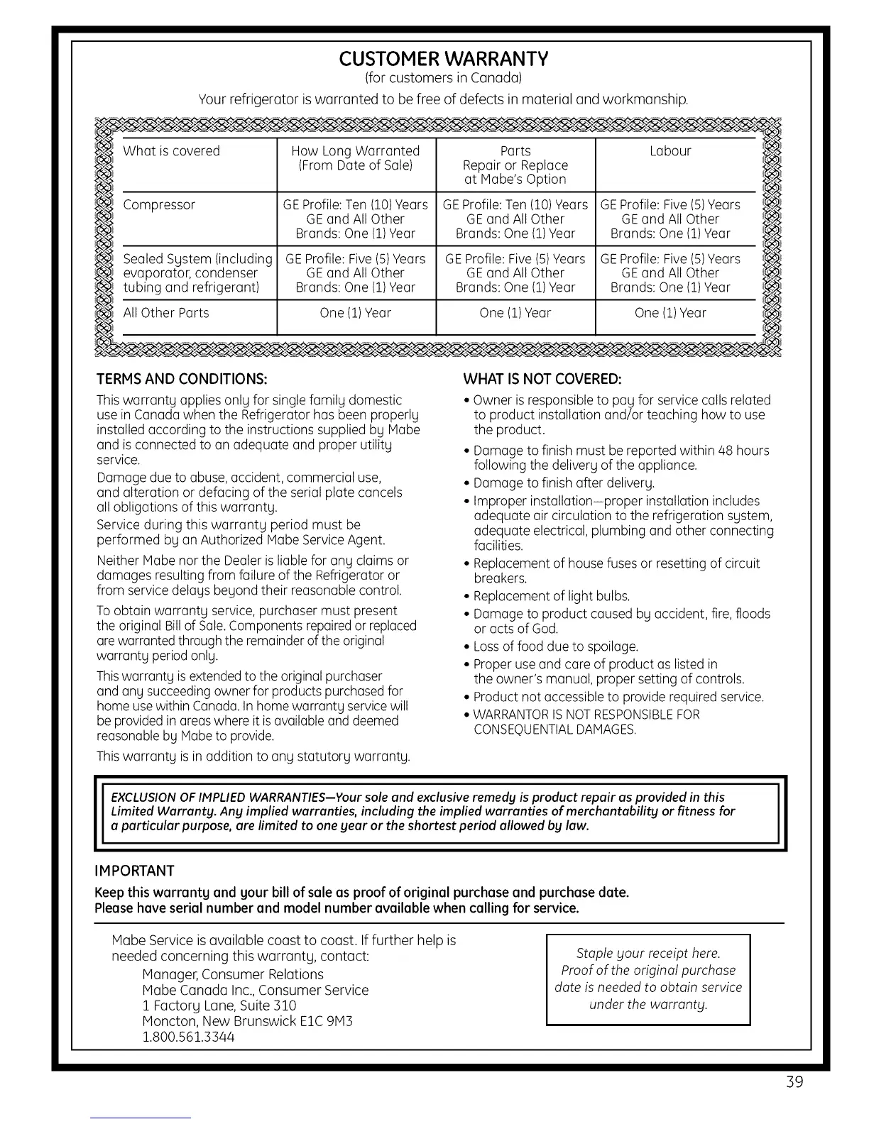 Mabe Canada Inc., Consumer Service