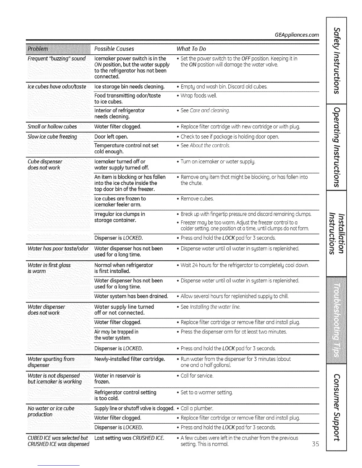 Smallor hollo--wcubes Water filter clogged. • Replacefilter cartridgewith new cartridgeor with plug.