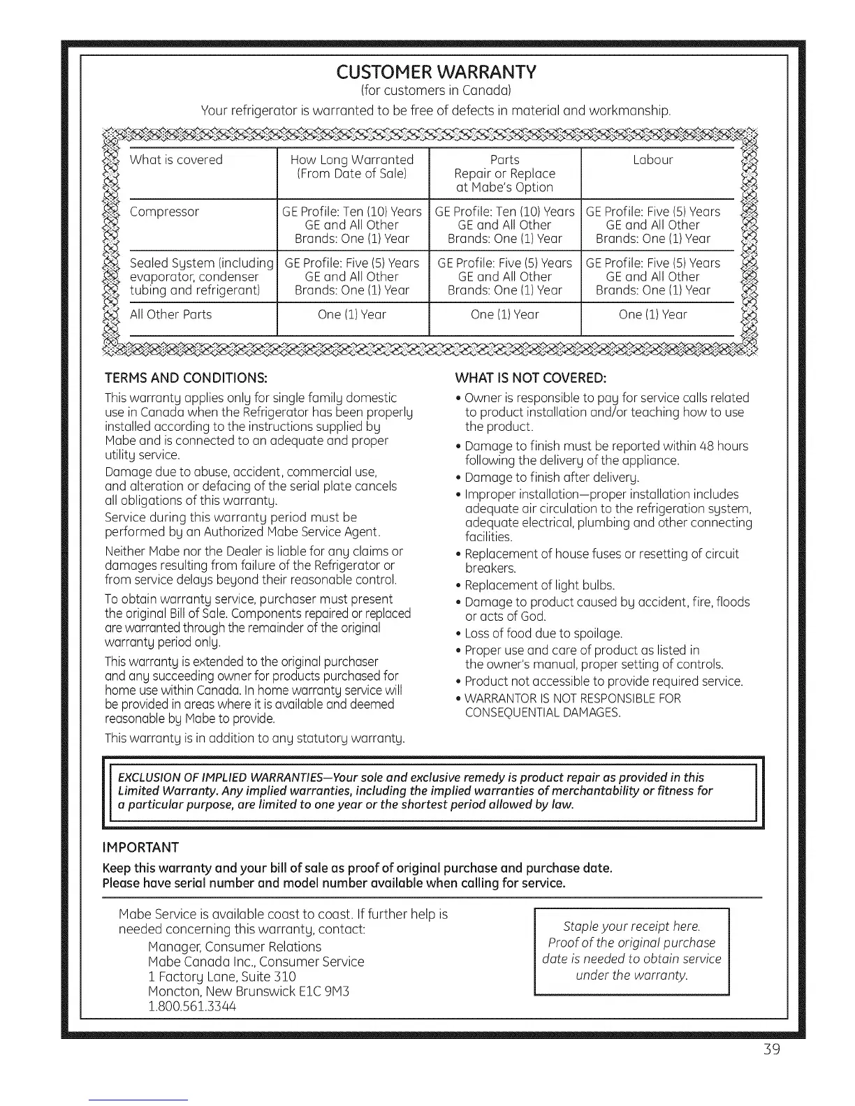 Mabe Canada Inc., Consumer Service