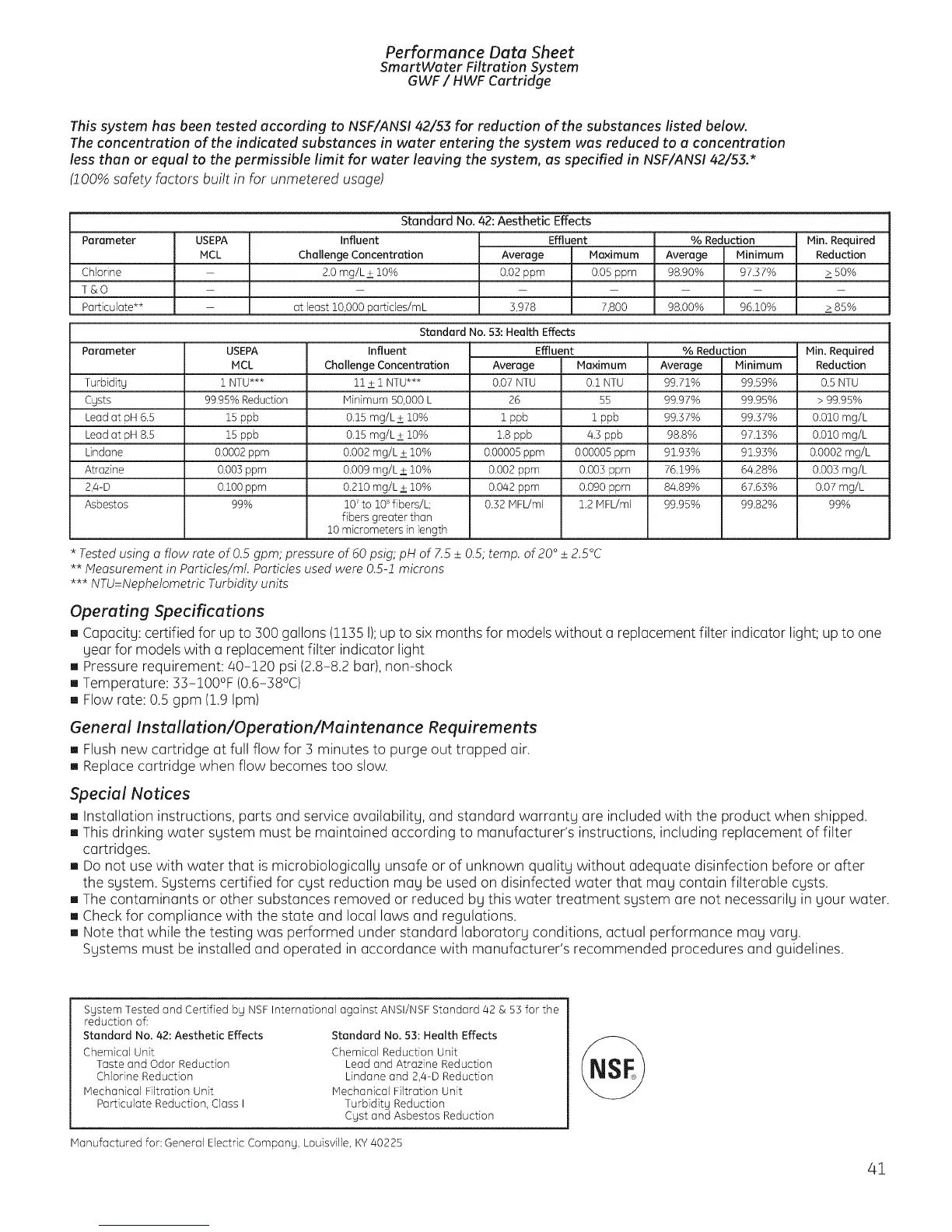 System Tested and Certified by NSF International against ANSI/NSF Standard 42 & 55 for the