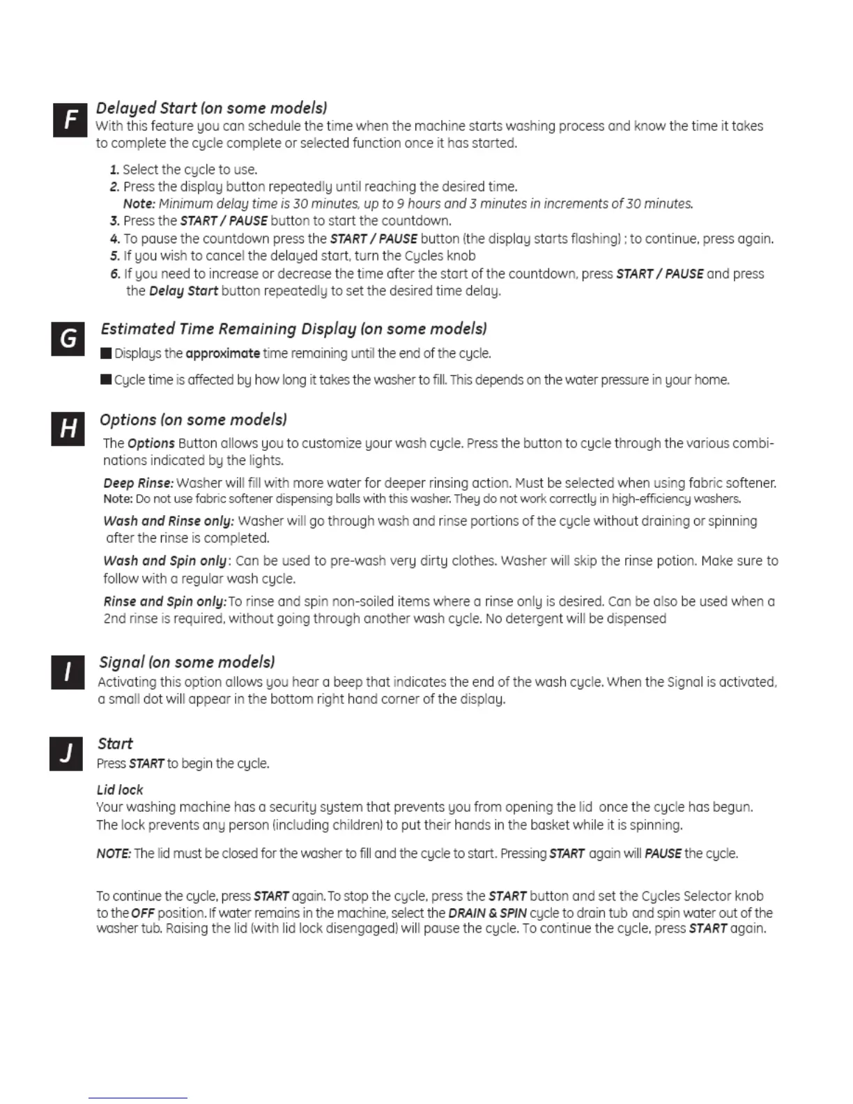 GE PTAN9150MWW - Control Panel Operation Guide (cont.); Delayed Start and Time Display Features; Wash Cycle Options and Signal; Starting Cycles and Lid Lock Operation
