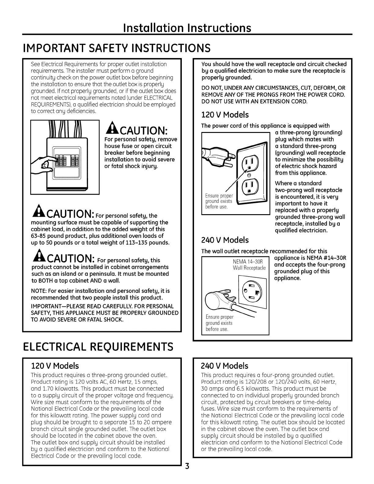 GE PVM1790 - Electrical Requirements; Ssesscssesseeeeneees; Important Safety Instructions