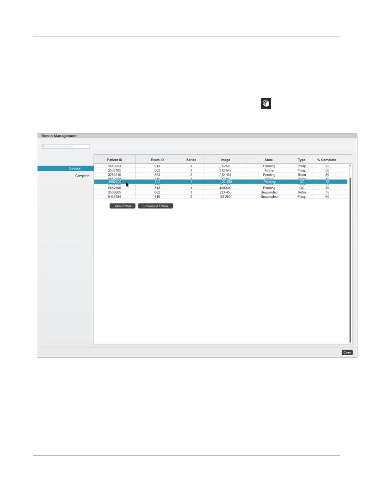 The General Recon Management window displays all currently active reconstruction jobs. You